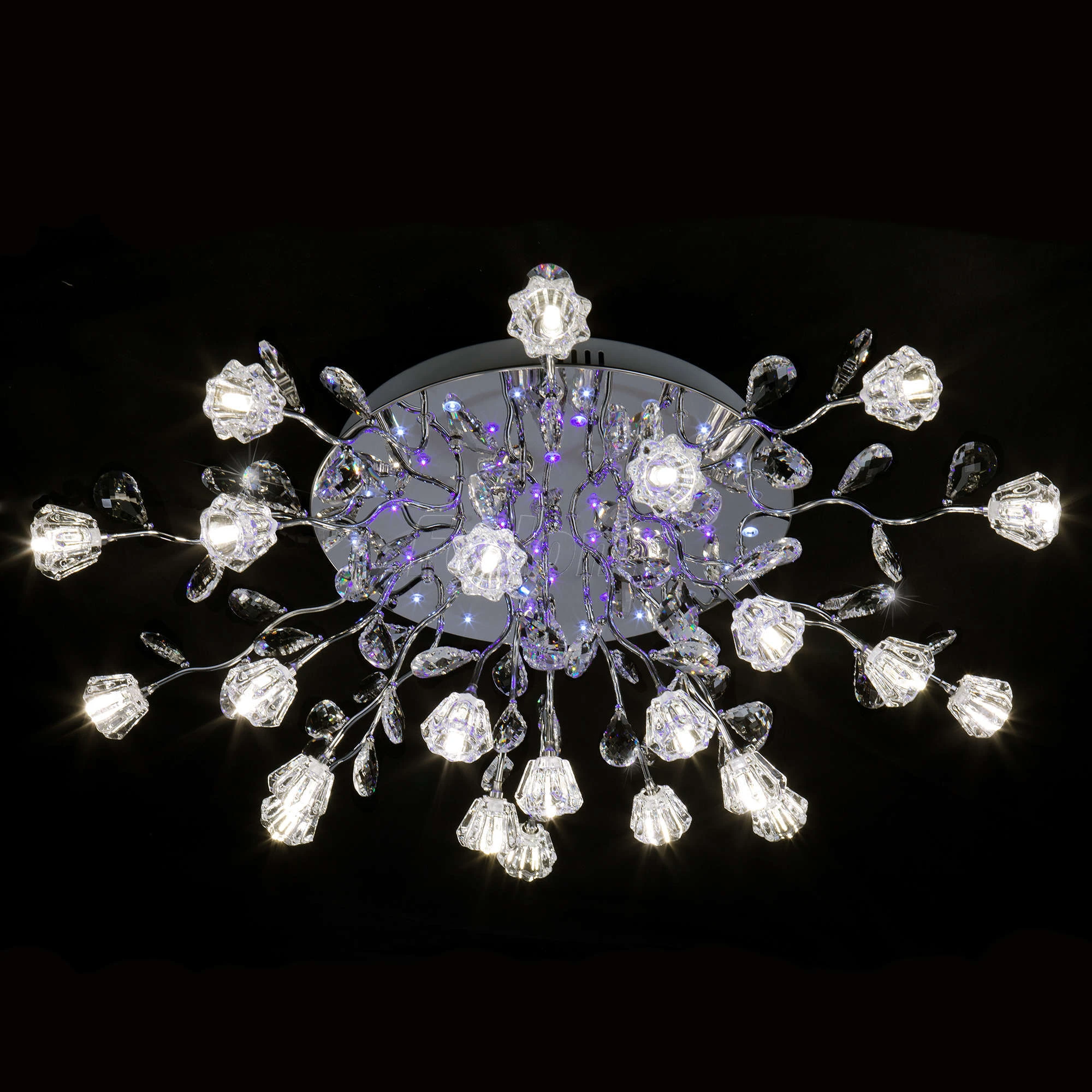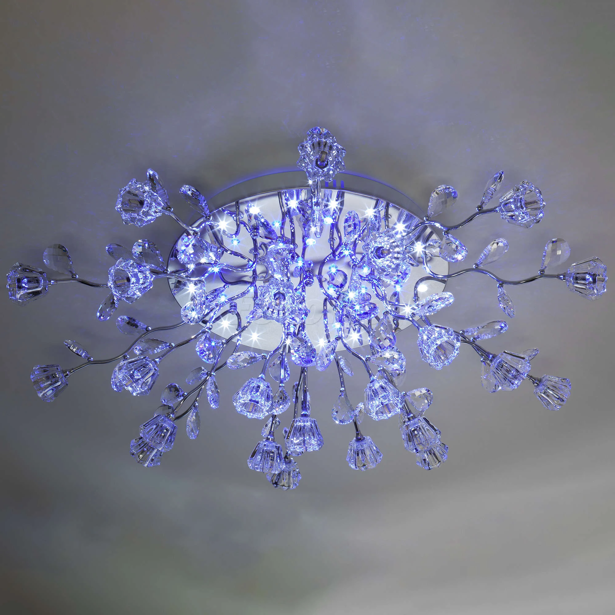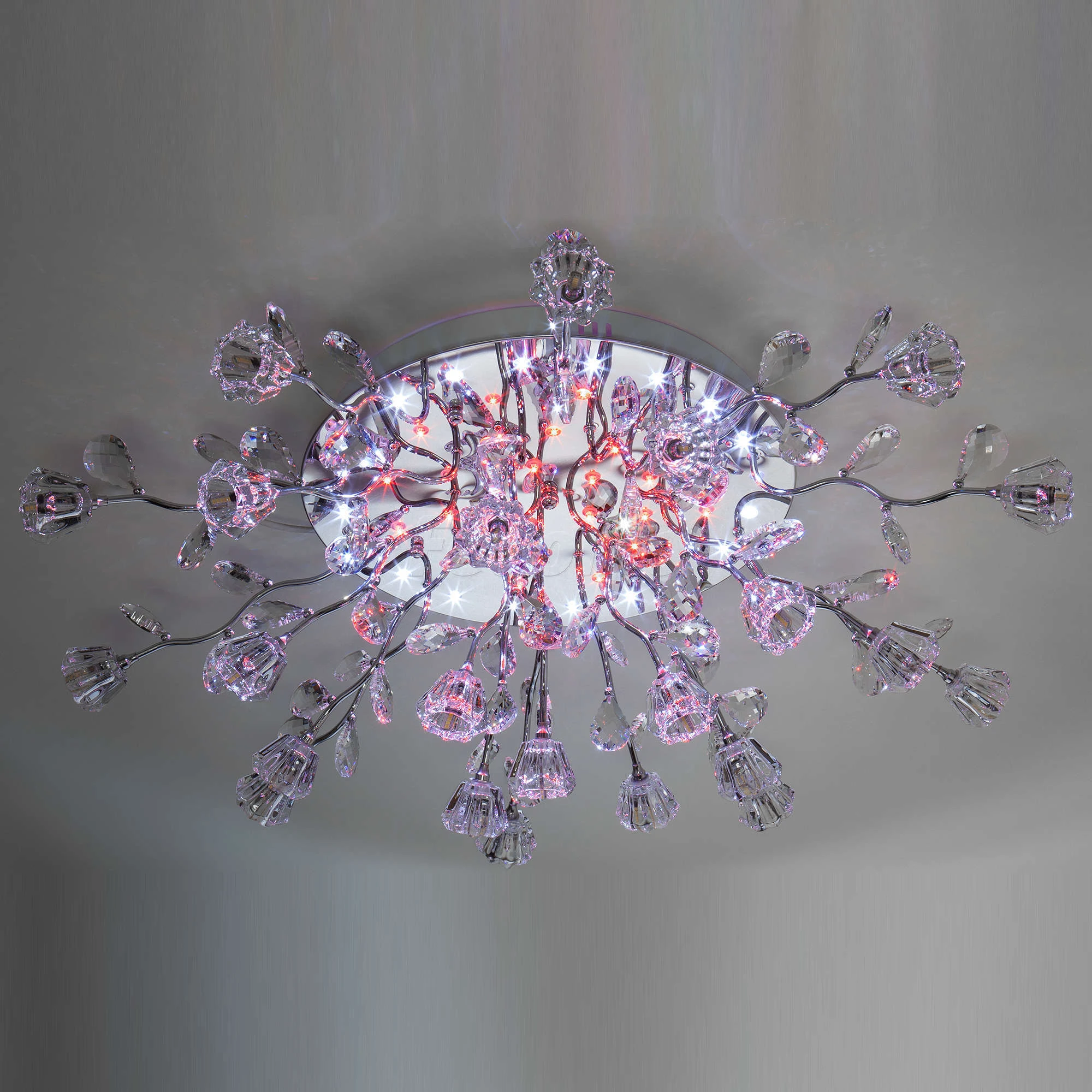 Люстра потолочная 80115/23 хром/синий+красный+фиолетовый из серии Bloomy от компании Eurosvet оснащена пультом управления и устанавливается на монтажную пластину. Современная люстра с цветами и листьями прекрасно подойдет в качестве источника основного света для гостиной, спальни, оформленных в стиле флористика. Основной цвет модели - хром, материал арматуры - металл. Люстра имеет 23 плафона со свечением вниз, материал изготовления - прозрачное стекло. Модель оснащена цоколем G4 (23xG4), имеет 23 лампочки с общей мощностью 80,5W и напряжением 230V. Светильник позволяет регулировать степень яркости. Габариты: длина - 800 мм, ширина - 800 мм, высота - 260 мм. В комплекте есть лампочки. Лучшая цена и условия доставки на Eurosvet 80115/23 хром/синий+красный+фиолетовый в интернет-магазине Fedomo.ru.
