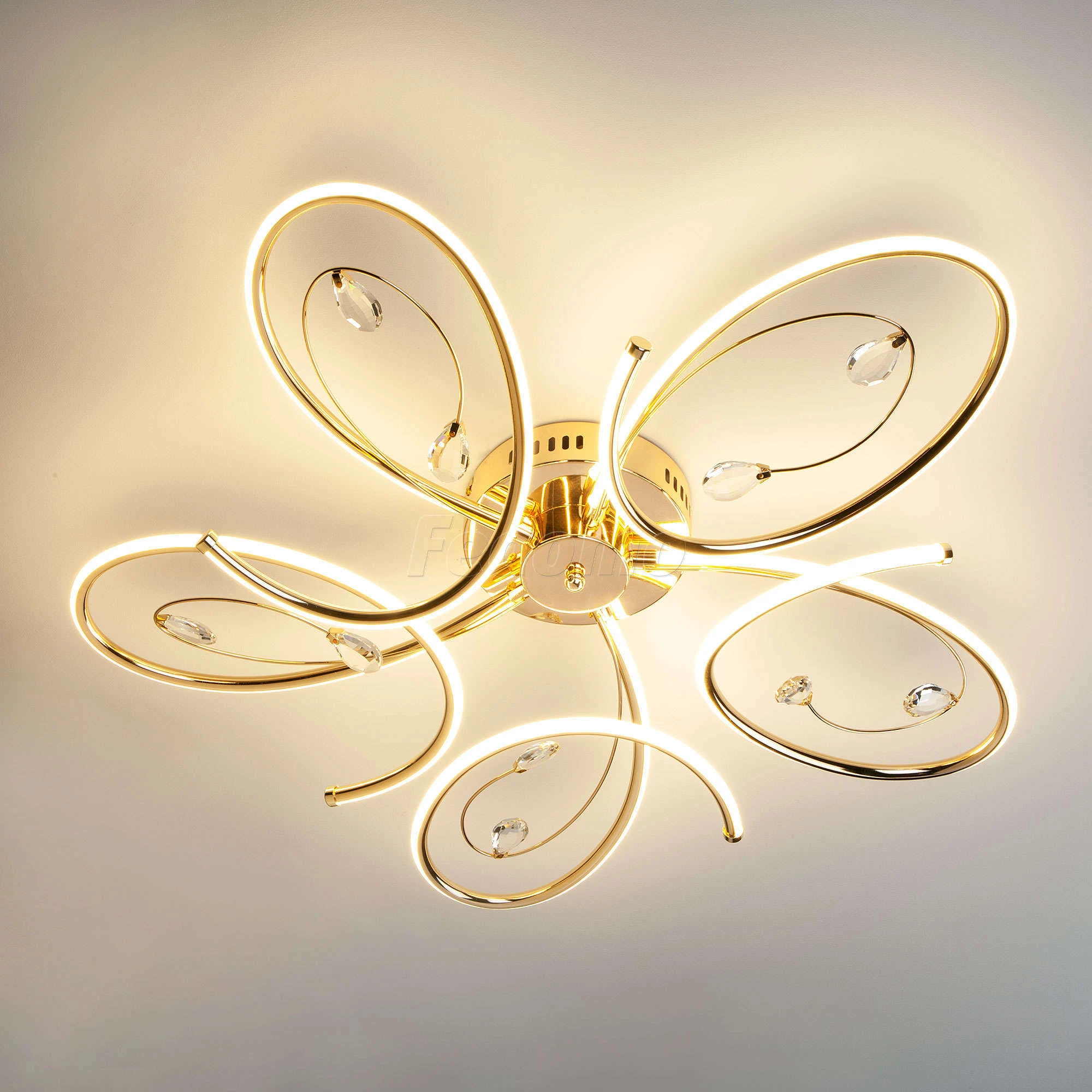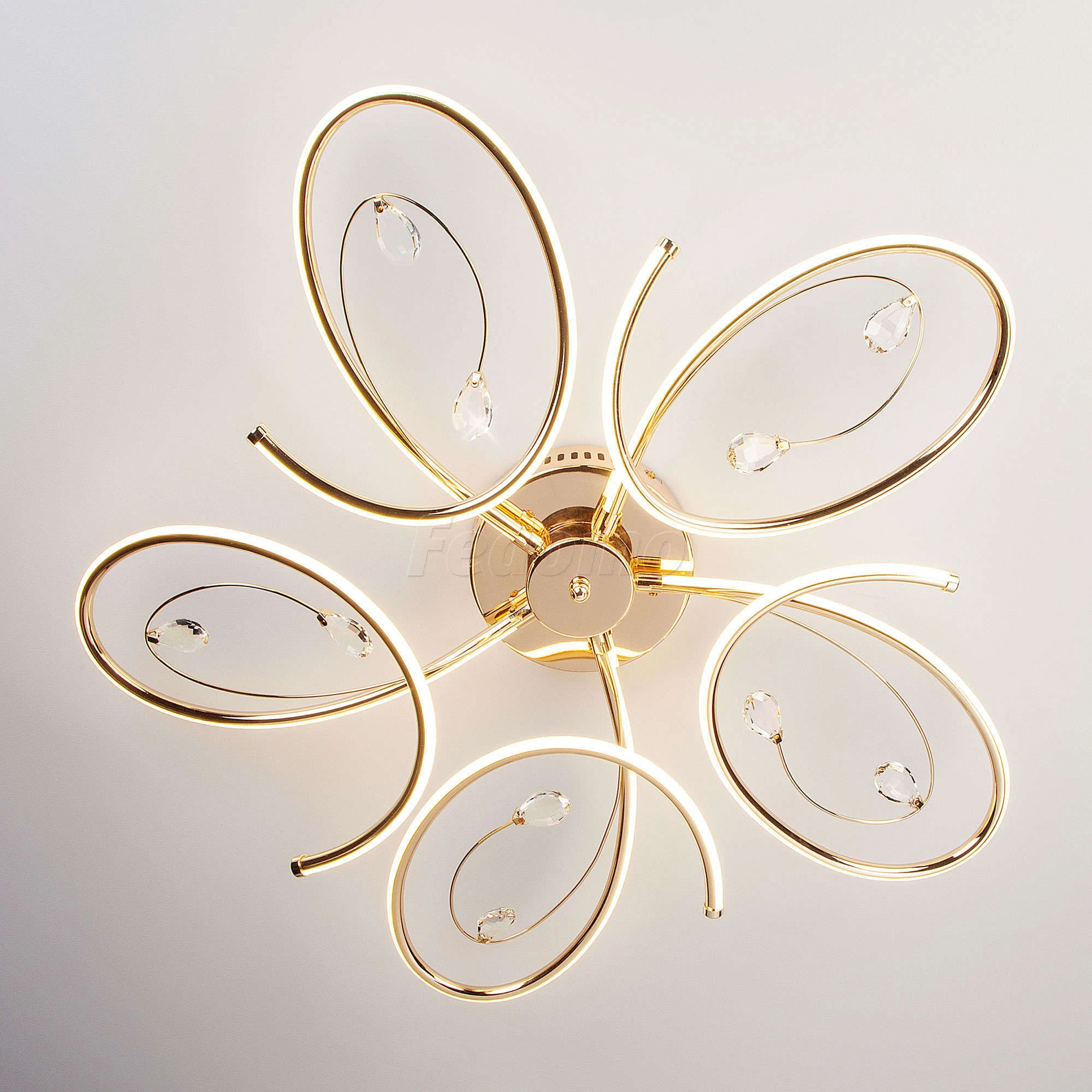 Люстра потолочная 90099/5 золото из серии Saona от компании Eurosvet устанавливается на монтажную пластину. Современная люстра украшена хрусталем и прекрасно подойдет в качестве источника основного света для гостиной, спальни, оформленных в стиле хай-тек, минимализм. Основной цвет модели - золото, материал арматуры - металл. Люстра имеет 5 рассеивателей со свечением вниз, материал изготовления - матовый акрил. Светодиодная модель с цоколем LED, имеет 450 светодиодов общей мощностью 90W и напряжением 220V. Светильник имеет цветовую температуру 4200К. Габариты: длина - 730 мм, ширина - 730 мм, высота - 150 мм. В комплекте есть лампочки. Срок службы модели составит не менее 50000 часов. Лучшая цена и условия доставки на Eurosvet 90099/5 золото в интернет-магазине Fedomo.ru.