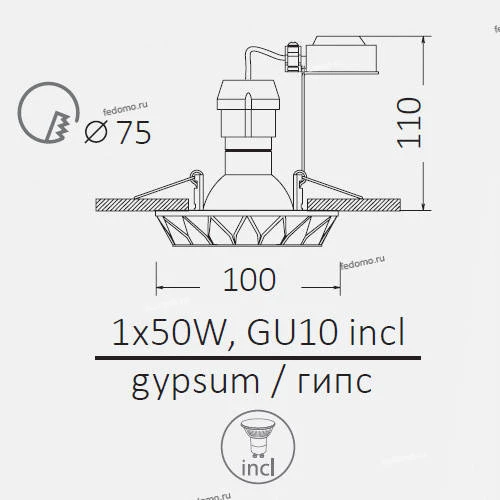 Точечный светильник встроенный A5253PL-1WC из серии Cratere от компании Arte Lamp удачно впишется в интерьер гостиной, кафе, кухни, прихожей и коридора, спальни, ванной, оформленных в стиле модерн. Светильник имеет 1 плафон и 1 лампочку с цоколем GU10 с мощностью 50W, напряжением 220V, цветовой температурой 2700К. Основной цвет и материал арматуры - бежевый гипс. Лампочки имеются в комплекте. Габариты модели: высота - 110 мм, диаметр - 100 мм. Срок службы изделия составляет не менее 1500 часов. Лучшая цена и условия доставки на Arte Lamp A5253PL-1WC в интернет-магазине Fedomo.ru.