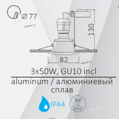 Точечный светильник встроенный A5444PL-3CC из серии Aqua от компании Arte Lamp удачно впишется в интерьер кафе, кухни, ванной, оформленных в современном стиле. Светильник имеет 1 плафон и 3 лампочки с цоколем GU10 с мощностью 50W, напряжением 220V, цветовой температурой 2700К. Основной цвет и материал арматуры - металл цвета хрома, материал плафона - стекло. Степень защиты от влаги и пыли IP44. В комплекте лампочки, 3 светильника. Габариты модели: высота - 130 мм, диаметр - 80 мм. Срок службы изделия составляет не менее 1500 часов. Лучшая цена и условия доставки на Arte Lamp A5444PL-3CC в интернет-магазине Fedomo.ru.