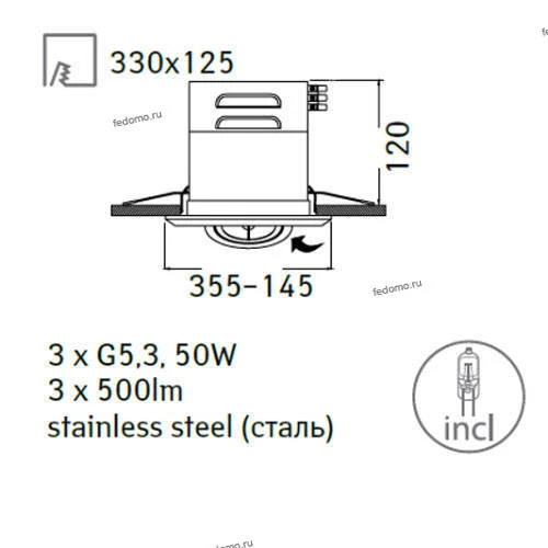 Точечный светильник встроенный A5930PL-3SI из серии Cardani Medio от компании Arte Lamp удачно впишется в интерьер экспозиции, гостиной, кабинета, кафе, кухни, магазина, прихожей и коридора, спальни, ванной, оформленных в современном стиле. Светильник имеет 1 плафон и 3 лампочки с цоколем G5.3 с мощностью 50W, напряжением 220V, цветовой температурой 2700К. Модель поддерживает подключение диммера. Основной цвет и материал арматуры - серебристый металл, материал плафона - металл. В комплекте лампочки, трансформатор. Габариты модели: длина - 355 мм, ширина - 145 мм, высота - 120 мм. Срок службы изделия составляет не менее 1500 часов. Лучшая цена и условия доставки на Arte Lamp A5930PL-3SI в интернет-магазине Fedomo.ru.
