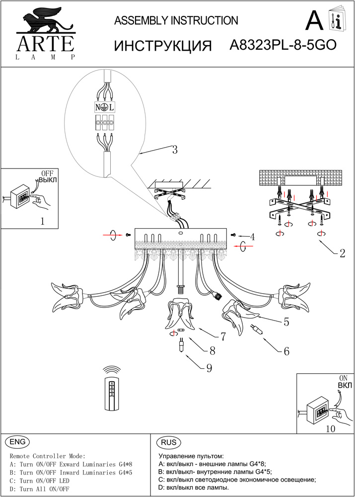 Люстра потолочная A8323PL-8-5GO из серии Zarina от компании Arte Lamp оснащена пультом управления и устанавливается на монтажную пластину. Люстра с цветами прекрасно подойдет в качестве источника основного света для прихожей и коридора, кафе, кухни, оформленных в стиле модерн, флористика, ар нуво. Основной цвет модели - золото, материал арматуры - металл. Люстра имеет 13 плафонов со свечением вниз, материал изготовления - стекло. Модель оснащена цоколем G4,LED, имеет 13,22 лампочки с общей мощностью 262,2W и напряжением 220V. Светильник имеет цветовую температуру 2700К. Габариты: высота - 190 мм, диаметр - 560 мм. В комплекте есть лампочки, трансформатор. Срок службы модели составит не менее 1500 часов. Лучшая цена и условия доставки на Arte Lamp A8323PL-8-5GO в интернет-магазине Fedomo.ru.