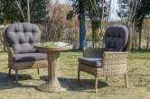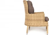 Кресло «Алиса» имеет нестандартную форму и хорошо сочетается с круглыми столиками. Размер модели – 710×820×1105 мм. Каркас выполнен из высококачественного алюминия, который оплетен круглым искусственным ротангом соломенного цвета. В садовое кресло укомплектовывается мягкими подушками. Они пошиты из износостойкого полиэстера серо-коричневого оттенка с плотностью 230гр/м2. Защитные свойства синтетического материала усиливаются благодаря влагоотталкивающей пропитке.
