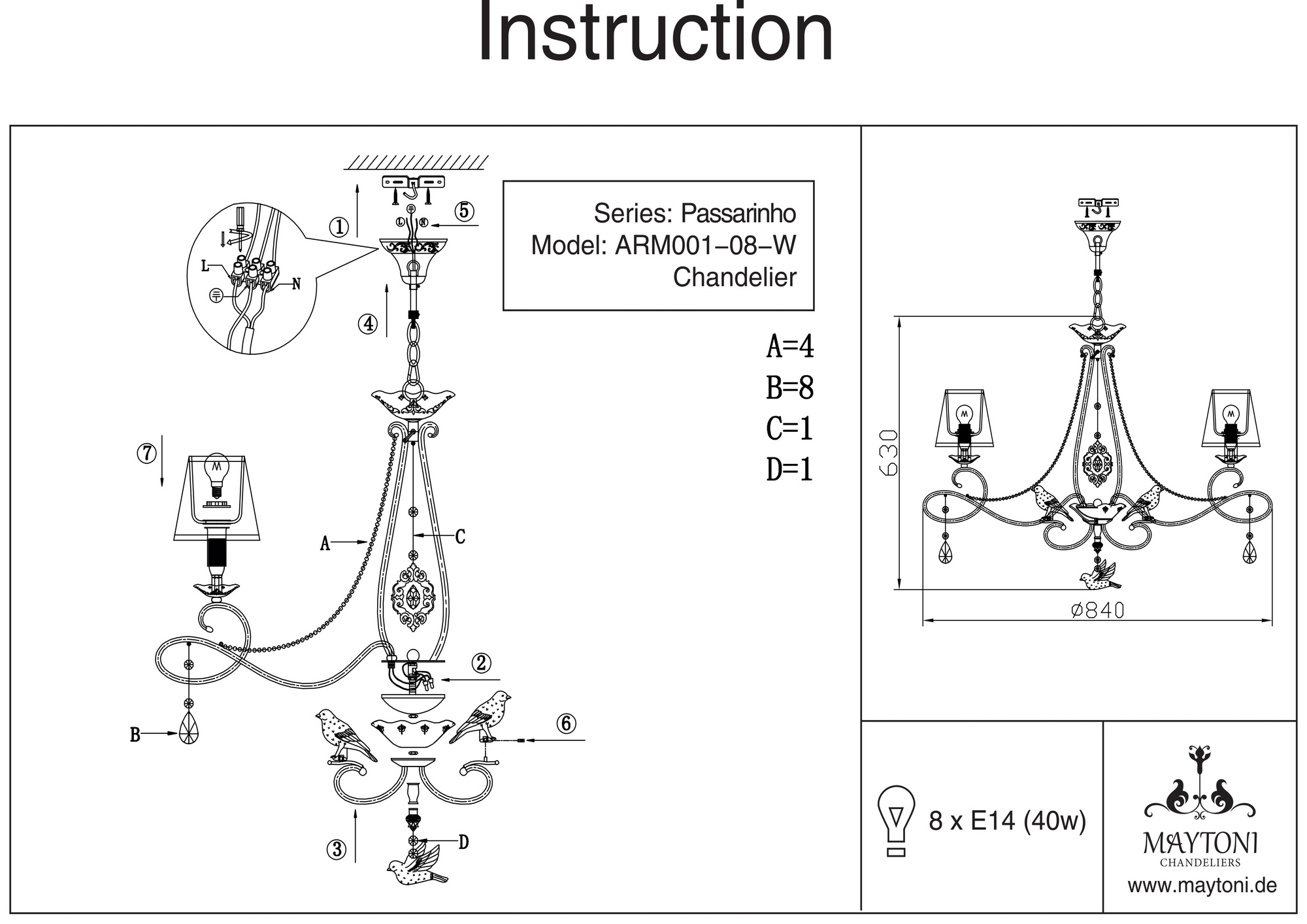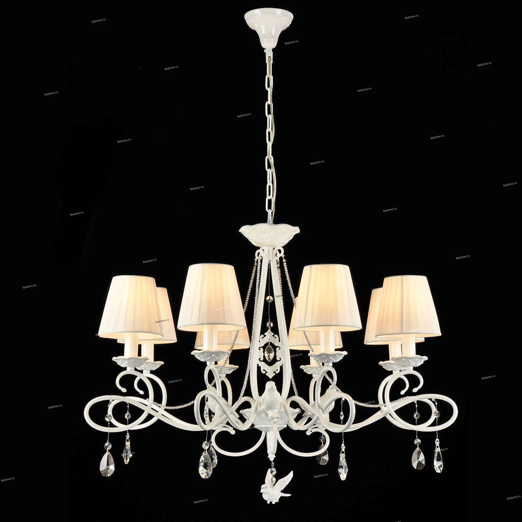 Люстра подвесная ARM001-08-W из серии Passarinho от компании Maytoni устанавливается на металлический крюк. Классическая люстра с птичками прекрасно подойдет в качестве источника основного света для гостиной, холла, спальни, кабинета, оформленных в стиле прованс. Основной цвет модели - белый, материал арматуры - металл. Люстра имеет 8 абажуров со свечением вверх, материал изготовления - ткань. Модель оснащена цоколем E14, имеет 8 лампочек с общей мощностью 320W и напряжением 220V. Светильник поддерживает подключение диммера. Габариты: высота - 1030 мм, диаметр - 840 мм. Лучшая цена и условия доставки на Maytoni ARM001-08-W в интернет-магазине Fedomo.ru.