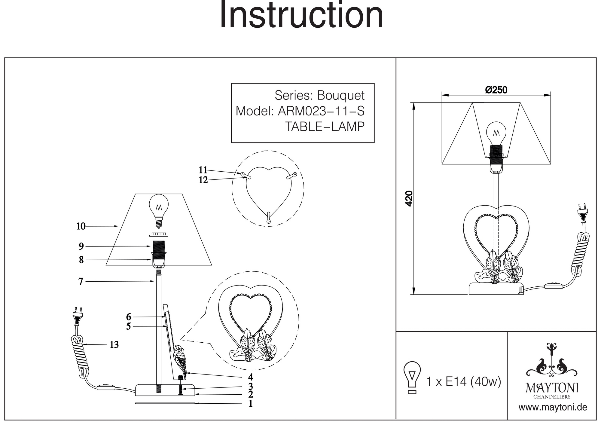 Интерьерная настольная лампа ARM023-11-S из серии Bouquet от компании Maytoni будет удачно смотреться на столе в гостиной, спальне, оформленных в классическом стиле. Интерьерная лампа с птичками и сердечками имеет 1 абажур и 1 лампочку с цоколем E14, мощностью 40W и напряжением 220V. Модель устанавливается на основание, есть возможность подключения диммера. Основной материал и цвет арматуры - серый металл, материал абажура - ткань. Габариты изделия: высота - 420 мм. Лучшая цена и условия доставки на Maytoni ARM023-11-S в интернет-магазине Fedomo.ru.