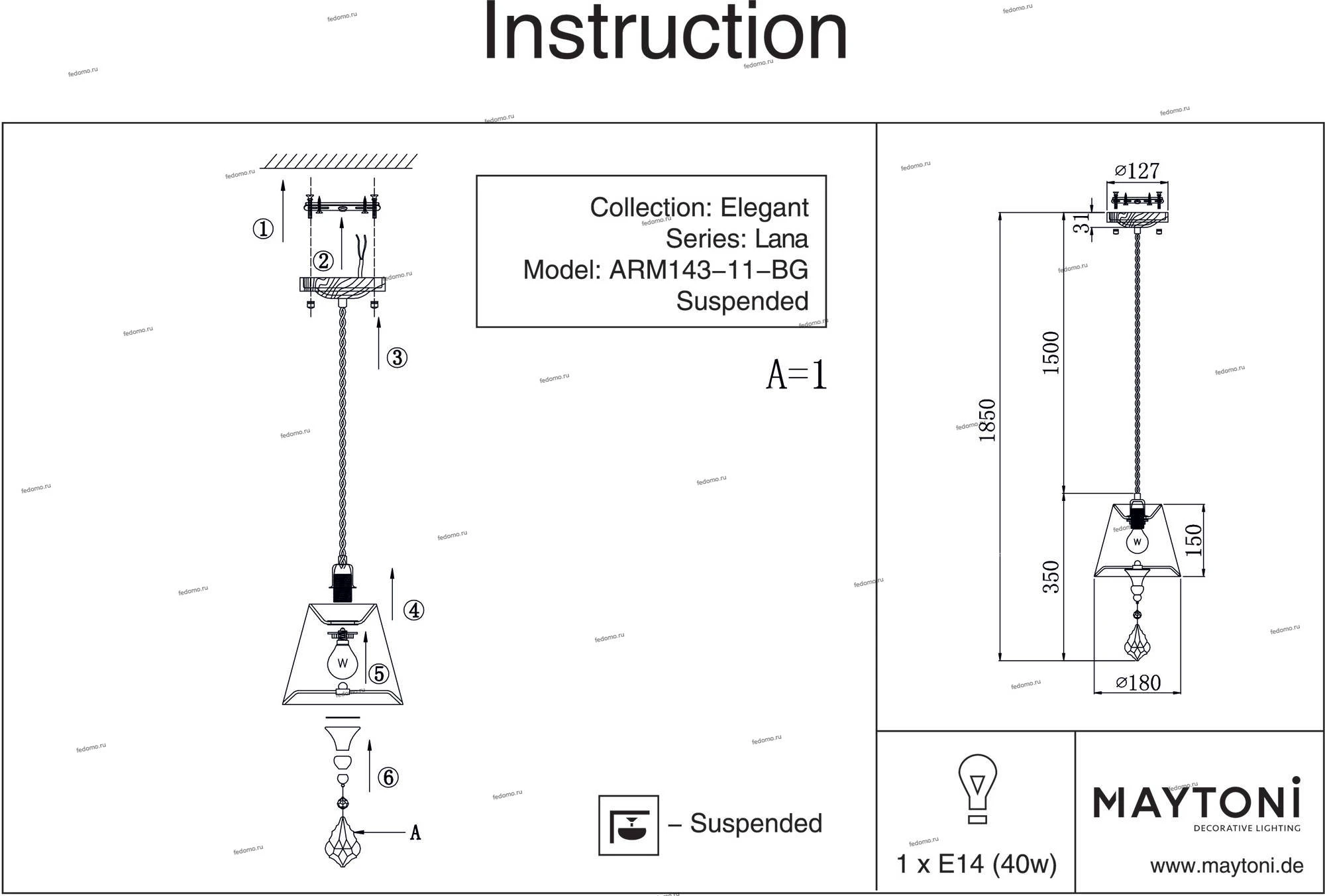 Арматура из металла покрашенного в цвет «кремового золота». Абажур из материала ПВХ, покрытого хлопковой тканью. Рекомендуем использовать компактные люминесцентные лампы (КЛЛ) или LED лампы