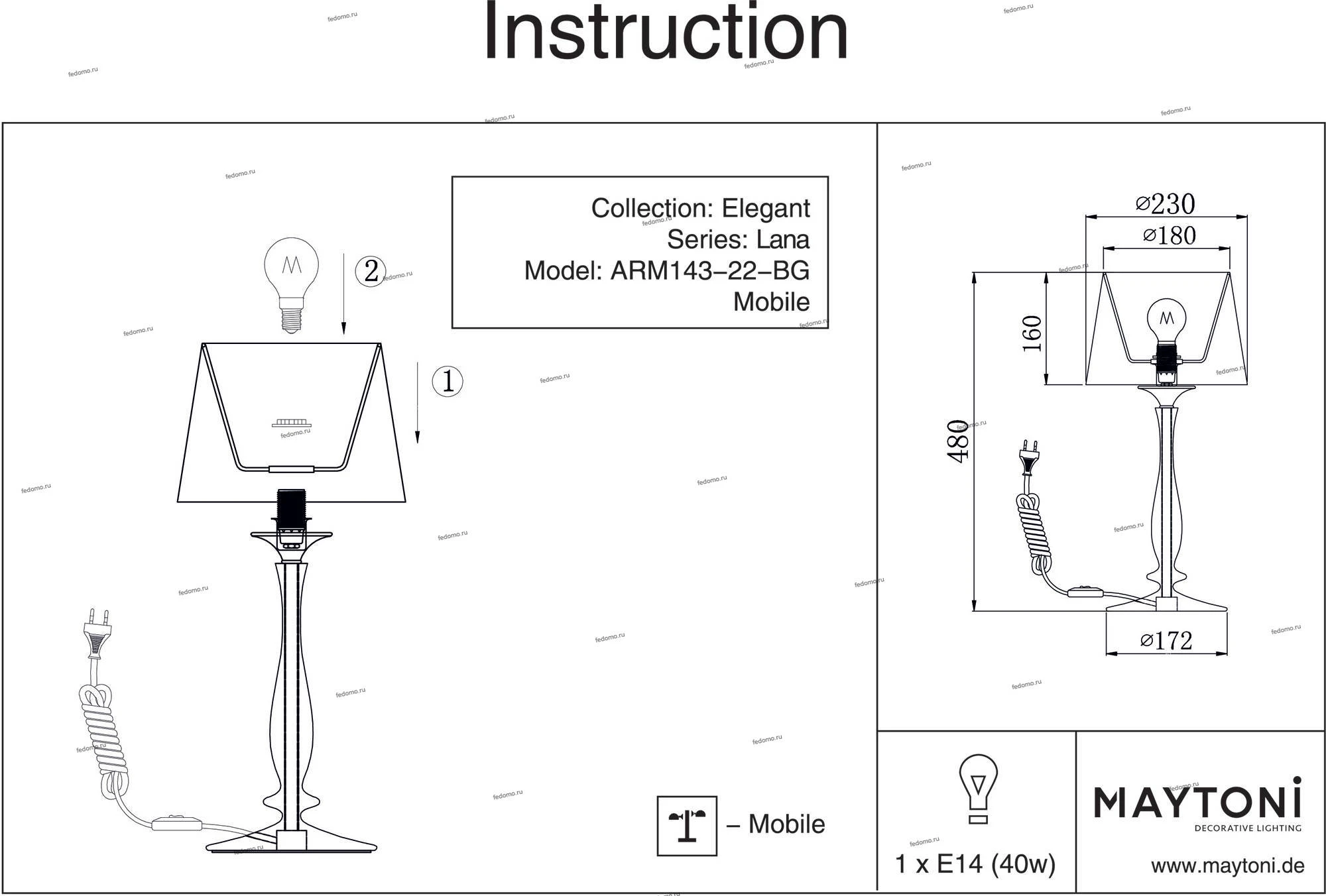 Арматура из металла покрашенного в цвет «кремового золота». Абажур из материала ПВХ, покрытого хлопковой тканью. Рекомендуем использовать компактные люминесцентные лампы (КЛЛ) или LED лампы