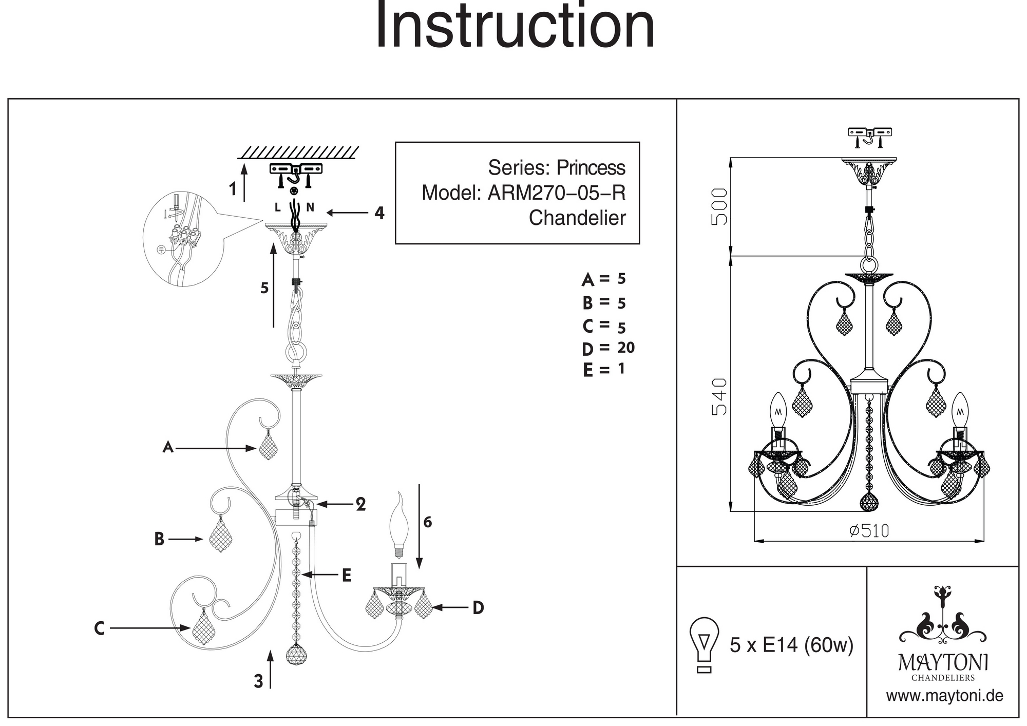 Люстра подвесная ARM270-05-R из серии Princess от компании Maytoni регулируется по высоте и устанавливается на металлический крюк. Классическая люстра в виде подсвечника прекрасно подойдет в качестве источника основного света для гостиной, спальни, кабинета, оформленных в стиле арт-деко, прованс. Основной цвет модели - бежевый, материал арматуры - металл. Модель оснащена цоколем E14 (5xE14), имеет 5 лампочек с общей мощностью 300W и напряжением 220V. Светильник поддерживает подключение диммера. Габариты: высота - 970 мм, диаметр - 510 мм. В комплекте есть перчатки для сборки хрусталя. Лучшая цена и условия доставки на Maytoni ARM270-05-R в интернет-магазине Fedomo.ru.