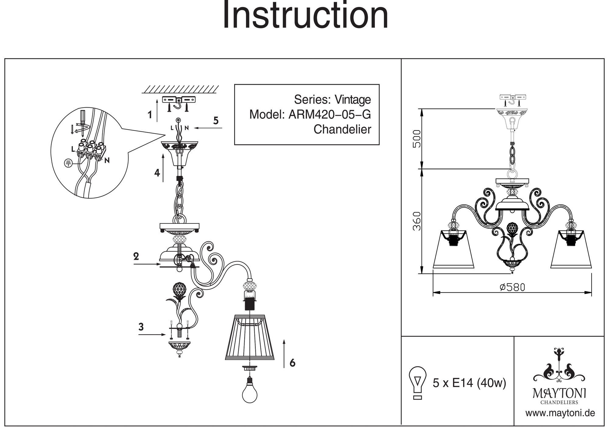 Люстра подвесная ARM420-05-G из серии Vintage от компании Maytoni регулируется по высоте и устанавливается на металлический крюк или монтажную пластину. Классическая люстра прекрасно подойдет в качестве источника основного света для гостиной, спальни, кухни, кабинета, оформленных в стиле прованс. Основной цвет модели - бежевый, материал арматуры - металл. Люстра имеет 5 абажуров со свечением вниз, материал изготовления - ткань. Модель оснащена цоколем E14 (5xE14), имеет 5 лампочек с общей мощностью 300W и напряжением 220V. Светильник поддерживает подключение диммера. Габариты: высота - 860 мм, диаметр - 580 мм. Лампочки в комплект не входят. Лучшая цена и условия доставки на Maytoni ARM420-05-G в интернет-магазине Fedomo.ru.