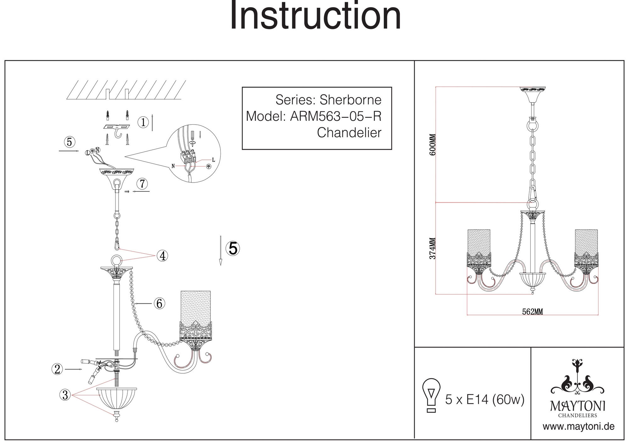 Люстра подвесная ARM563-05-R из серии Sherborne от компании Maytoni устанавливается на металлический крюк. Классическая люстра прекрасно подойдет в качестве источника основного света для гостиной, спальни, кабинета, оформленных в стиле замковый. Основной цвет модели - белый, материал арматуры - металл. Люстра имеет 5 плафонов со свечением вверх, материал изготовления - стекло. Модель оснащена цоколем E14 (5xE14), имеет 5 лампочек с общей мощностью 300W и напряжением 220V. Светильник поддерживает подключение диммера. Габариты: ширина - 562 мм, высота - 974 мм. Лампочки в комплект не входят. Лучшая цена и условия доставки на Maytoni ARM563-05-R в интернет-магазине Fedomo.ru.