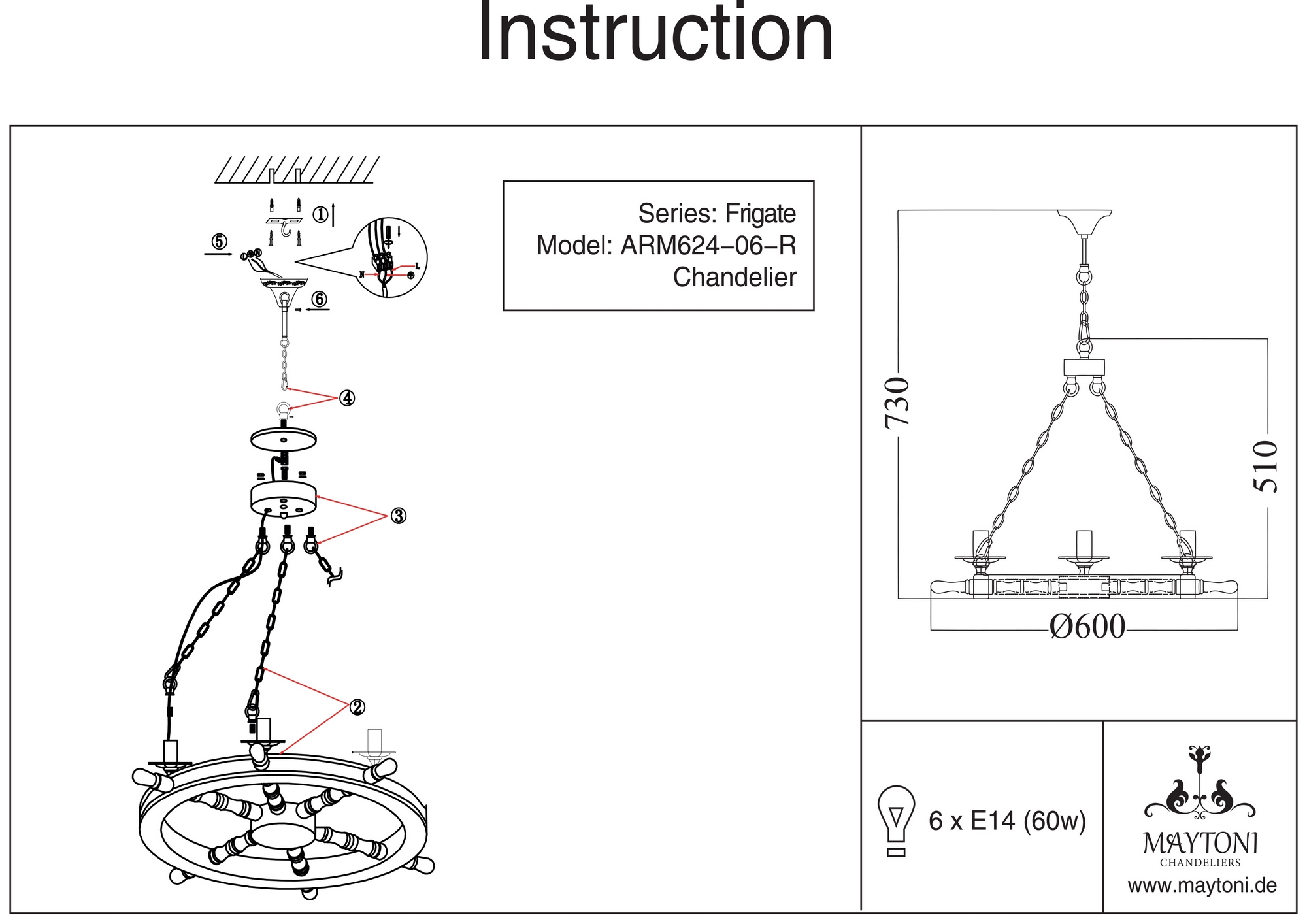 Люстра подвесная ARM624-06-R из серии Frigate от компании Maytoni устанавливается на металлический крюк. Классическая люстра в виде подсвечника со штурвалом прекрасно подойдет в качестве источника основного света для дачи, гостиной, кабинета, кухни, спальни, оформленных в стиле морской. Основной цвет модели - коричневый, материал арматуры - металл, дерево. Модель оснащена цоколем E14 (6xE14), имеет 6 лампочек с общей мощностью 360W и напряжением 220V. Светильник поддерживает подключение диммера. Габариты: высота - 660 мм, диаметр - 600 мм. Лампочки в комплект не входят. Лучшая цена и условия доставки на Maytoni ARM624-06-R в интернет-магазине Fedomo.ru.