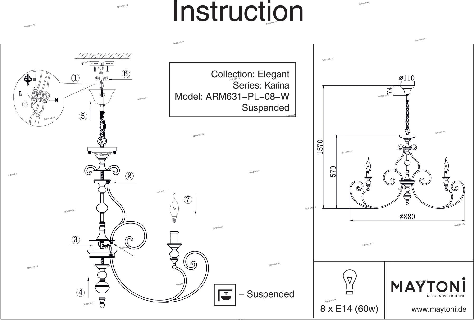 Люстра подвесная ARM631-PL-08-W из серии Karina от компании Maytoni регулируется по высоте и устанавливается на металлический крюк или монтажную пластину. Классическая люстра в виде подсвечника прекрасно подойдет в качестве источника основного света для гостиной, спальни, оформленных в стиле прованс. Основной цвет модели - белый, материал арматуры - металл. Модель оснащена цоколем E14 (8xE14), имеет 8 лампочек с общей мощностью 480W и напряжением 220V. Светильник поддерживает подключение диммера. Габариты: высота - 1496 мм, диаметр - 880 мм. Лампочки в комплект не входят. Лучшая цена и условия доставки на Maytoni ARM631-PL-08-W в интернет-магазине Fedomo.ru.