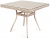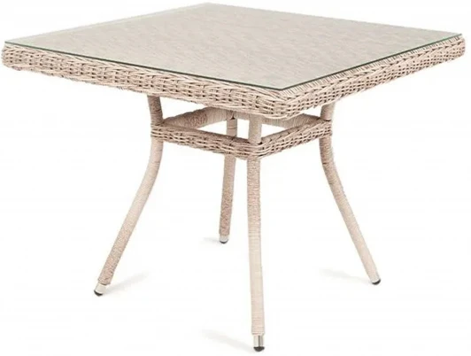 Плетеный стол для сада из искусственного ротанга «Айриш» бежевого цвета идеально вписывается в обеденное пространство на открытом воздухе. В основе стола скелет из алюминия, столешница выполнена из ударопрочного стекла толщиной 5 мм. Габариты: 900×900×750 мм, которые позволяют уместить до четырех человек.