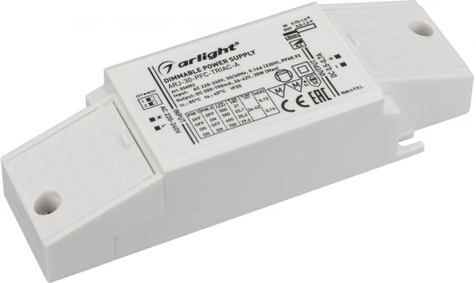 Диммируемый источник тока по стандарту TRIAC с гальванической развязкой для светильников и мощных светодиодов. Входное напряжение 220-240 VAC. Выходные параметры: 26-42 В, 500-700 mА, 30 Вт. Выбор значения тока осуществляется DIP-переключателем. Встроенный PFC >0,92. Негерметичный пластиковый корпус IP 20. Габаритные размеры длина 138 мм, ширина 44 мм, высота 30 мм. Гарантийный срок 5 лет.