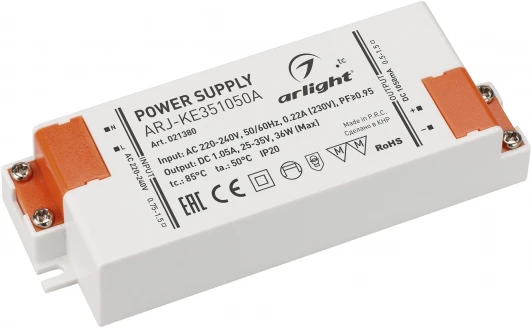 Источник тока с гальванической развязкой для светильников и мощных светодиодов. Входное напряжение 220-240 VAC. Выходные параметры: 25-35 В, 1050 mА, 37 Вт. Встроенный PFC >0.95. Негерметичный пластиковый корпус IP 20. Габаритные размеры длина 117 мм, ширина 42 мм, высота 24 мм. Гарантийный срок 5 лет.