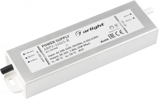 Источник напряжения с гальванической развязкой для светодиодных изделий. Входное напряжение 200-240 VAC. Выходные параметры: 24 В, 1,88 А, 45 Вт. Встроенный PFC >0,5. Герметичный алюминиевый корпус IP 67. Рабочая температура -25…+50C⁰. Габаритные размеры длина 148 мм, ширина 40 мм, высота 22 мм. Совместим с диммерами с частотой ШИМ более 5кГц. Гарантийный срок 3 года.