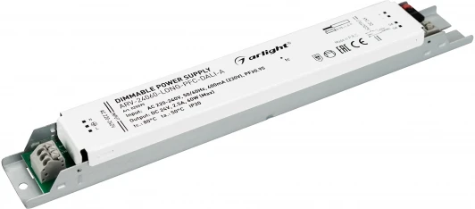 Блок питания 24V, ток 2,5А, 60Вт, с управлением DALI и функцией PUSH DIM, с корректором мощности, PF>0,95. Тонкий металлический корпус IP20. Вход: 220-240VAC. Выход: 24VDC 2.5A. Размер 250х30х21 mm. Совместимость со стандартом EMC. Гарантия 5 лет.