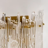 Металлическое основание настенного бра гальванизировано в цвет латуни. Настенное бра декорировано пластинами оригинальной формы из прозрачного и белого стекла.