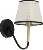Основание бра выполнено из металла и окрашено в черный цвет, отдельные элементы гальванизированы в цвет античной бронзы. Традиционный источник света закрыт белым тканевым абажуром с линейным рисунком и имеет внутри термостойкий акрил. Края абажура отделаны черным кантом и прошиты.