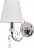 Металлическое основание настенного бра гальванизировано в цвет хрома. Традиционный источник света закрыт текстильным абажуром белого цвета с прозрачным термостойким акрилом внутри. Абажур прошит и отделан кантом сверху и снизу. Вертикальное бра декорировано прозрачным хрусталем.