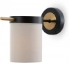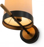 Арматура из металла. Основной цвет — чёрный, декоративные элементы в цвете латунь. Тканевые бежевые абажуры-цилиндры украшены чёрными металлическими основаниями. Компактные размеры для невысоких потолков. Источник света — лампа с цоколем Е14.