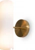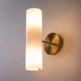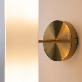 Арматура — металлическая, цвет — латунь. Стеклянные белые плафоны-цилиндры мягко рассеивают свет в стороны. Открытые края плафонов и глянцевая поверхность дают дополнительный свет в вверх и вниз для максимальной освещенности. Источник света — лампа с цоколем Е14.