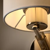 Арматура – металл + стекло, цвет - золото. Универсальные тканевые абажуры в белом цвете. Декоративные элементы из прозрачного рельефного стекла. Источник света - лампа с цоколем Е27.
