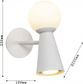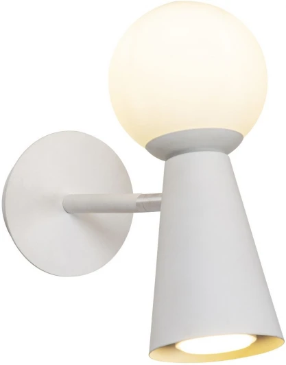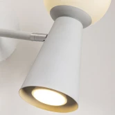 Каркас белого цвета, поворотный плафон с двумя источниками света - стеклянный выдувной матовый шар с лампой G9 и металлический конус с лампой GU10, лампы можно менять