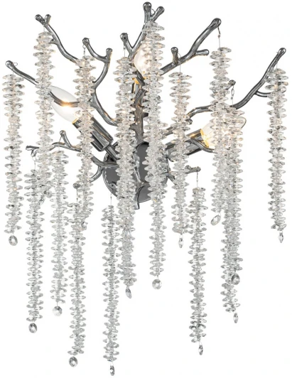 Настенный светильник серии EIVA выполнен из сплава алюминия и гальванизирован в цвет хрома и декорирован гроздьями из хрусталя в форме октагон. Светильники серии отличает повышенное содержание хрусталя (18 хрустальных гроздьев) и лампы с цоколем Е14.