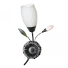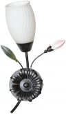Основание светильника выполнено из металла и обработано по технологии хай-лайт, где основной цвет черный и декоративный слой серебряного цвета. Плафон из стекла отлит в сложную форму и окрашен изнутри в белый цвет. Декоративный лист окрашен в зеленый цвет. Декор в виде бутона выполнен из фарфора и окрашен в розовый цвет. Актуальный дизайн флористической тематики.