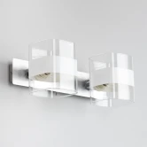 Основание металлическое, прямоугольной формы, цвет алюминий с декоративными хромированными элементами. Плафоны из прозрачного стекла со стильной белой полосой. На корпусе расположен удобный выключатель. В светильнике используется 2 лампы с цоколем Е14, форма колбы шарик, максимальной мощностью для ламп накаливания 60Вт (В комплект не входят приобретаются отдельно).