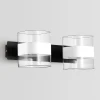 Основание металлическое, прямоугольной формы, цвет чёрный с декоративными хромированными элементами. Плафоны из прозрачного стекла со стильной белой полосой. На корпусе расположен удобный выключатель. В светильнике используется 2 лампы с цоколем Е14, форма колбы шарик, максимальной мощностью для ламп накаливания 60Вт (В комплект не входят приобретаются отдельно).