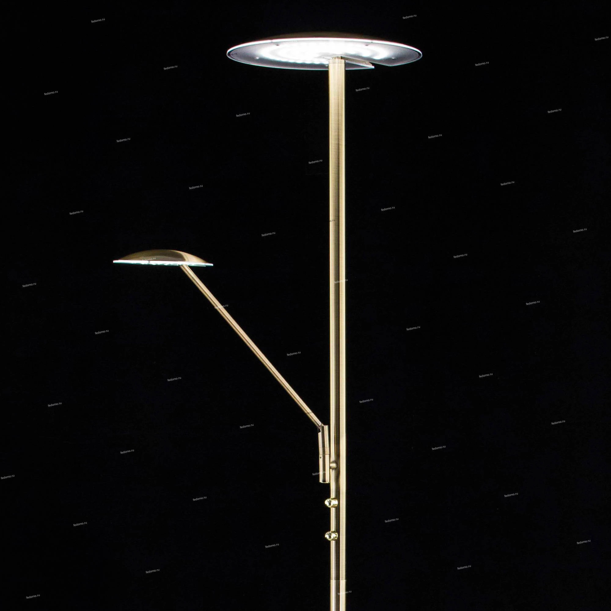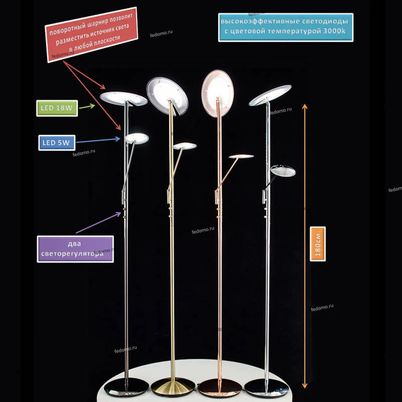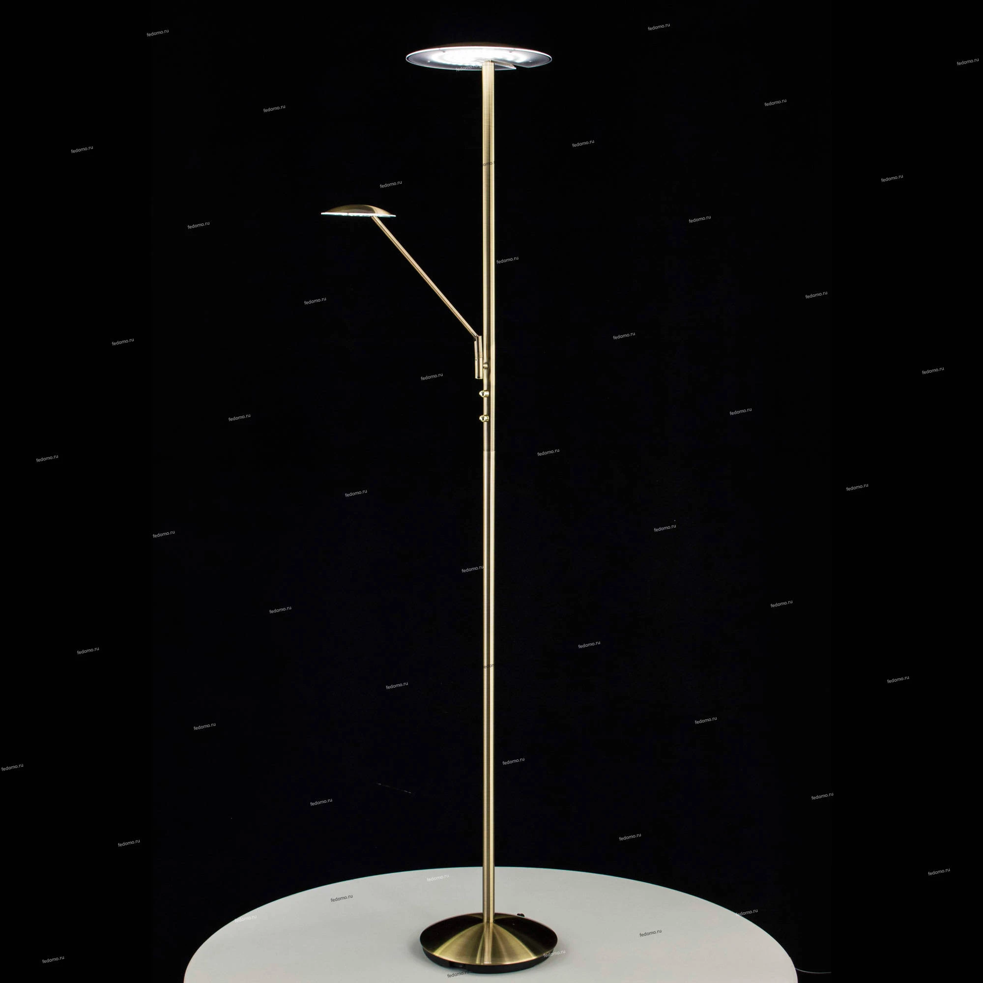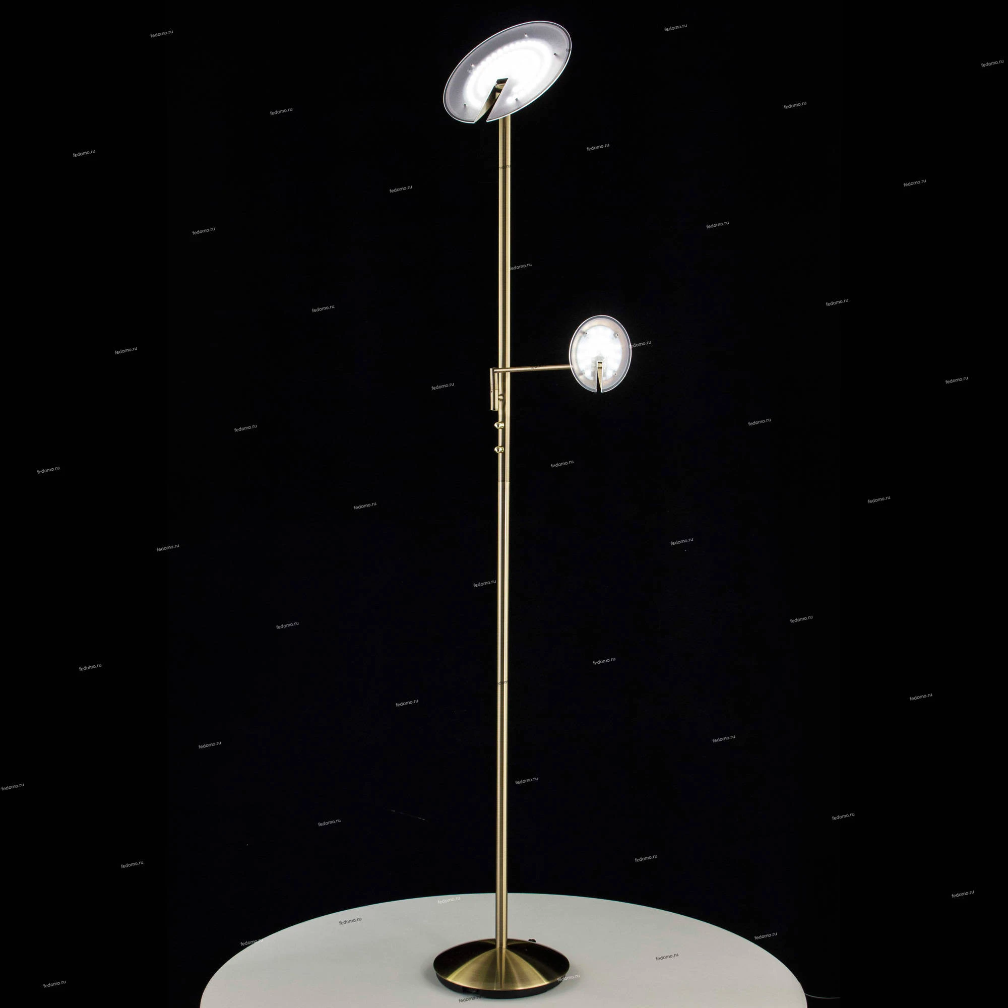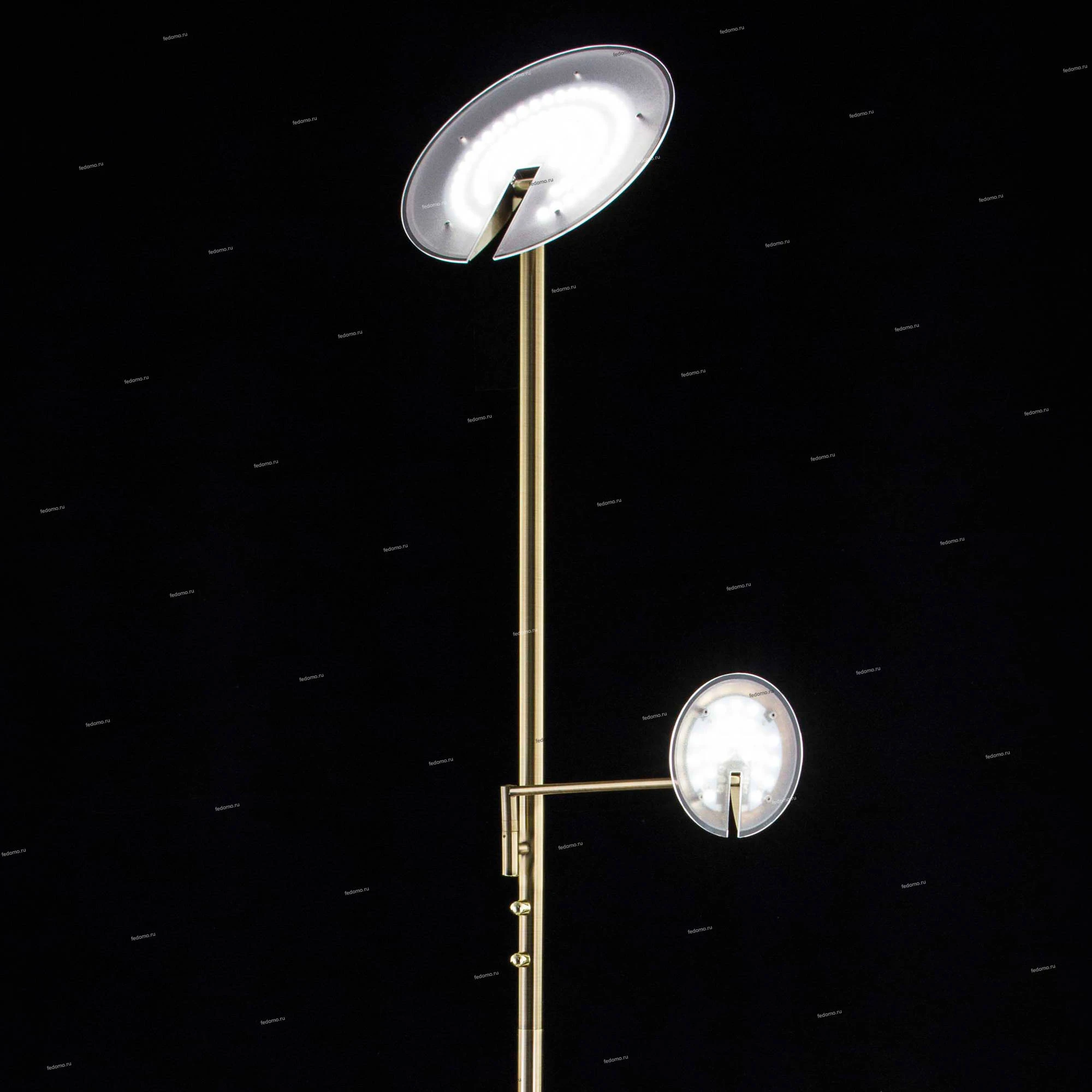 Торшер высотой 180 см с двумя регулируемыми по направлению светодиодными головами, диаметр основания 28см, потолочная голова D=28см с литым корпусом, мощностью 18Вт с диммером 20-100%; голова для чтения D=13.5 см с литым корпусом, мощность 5 Вт с диммеро