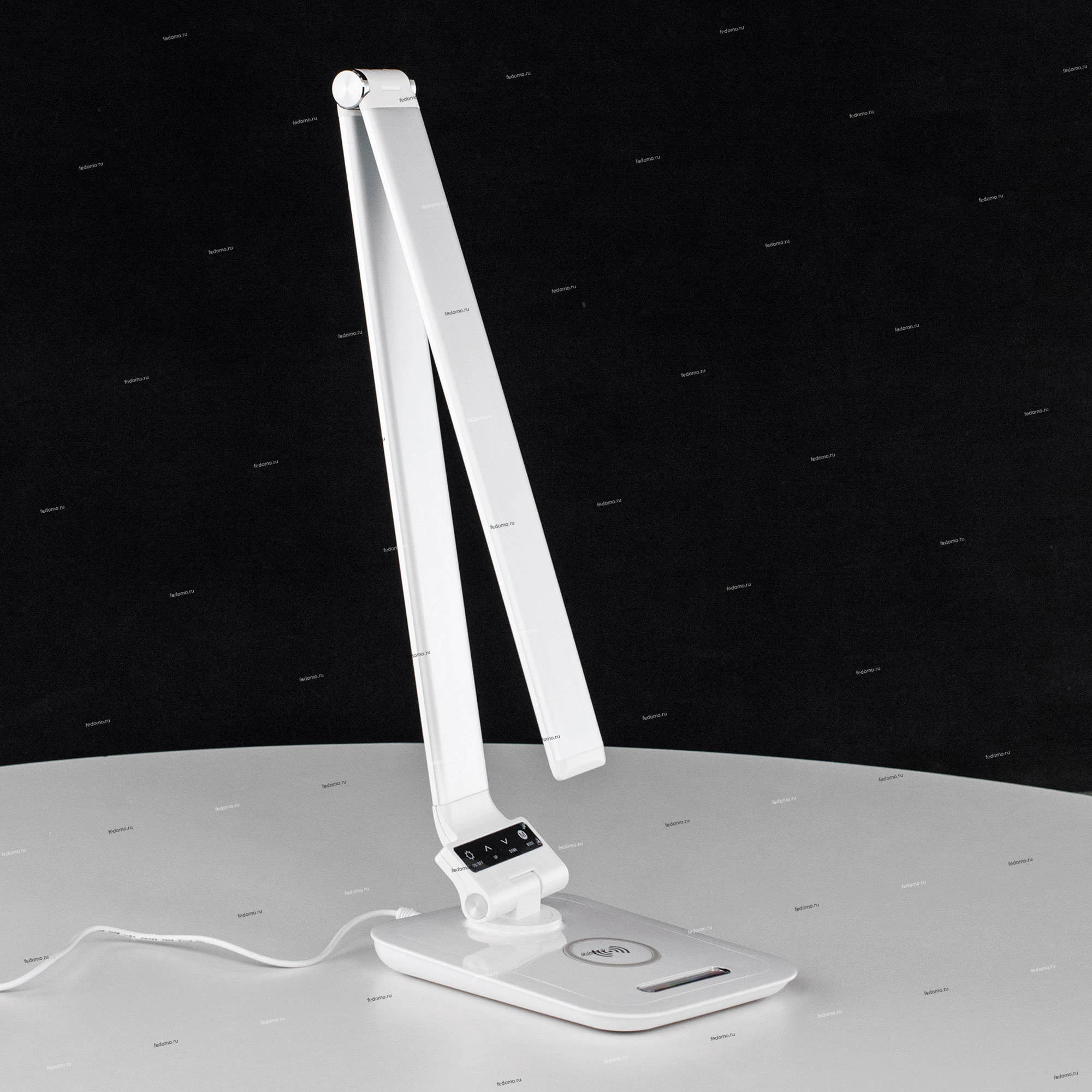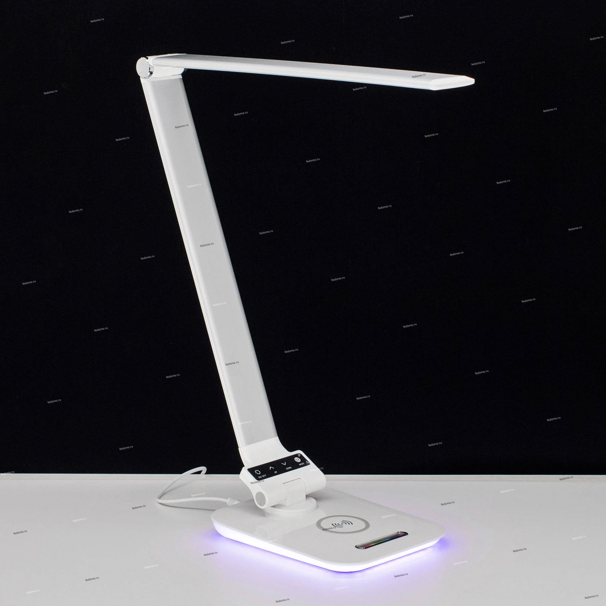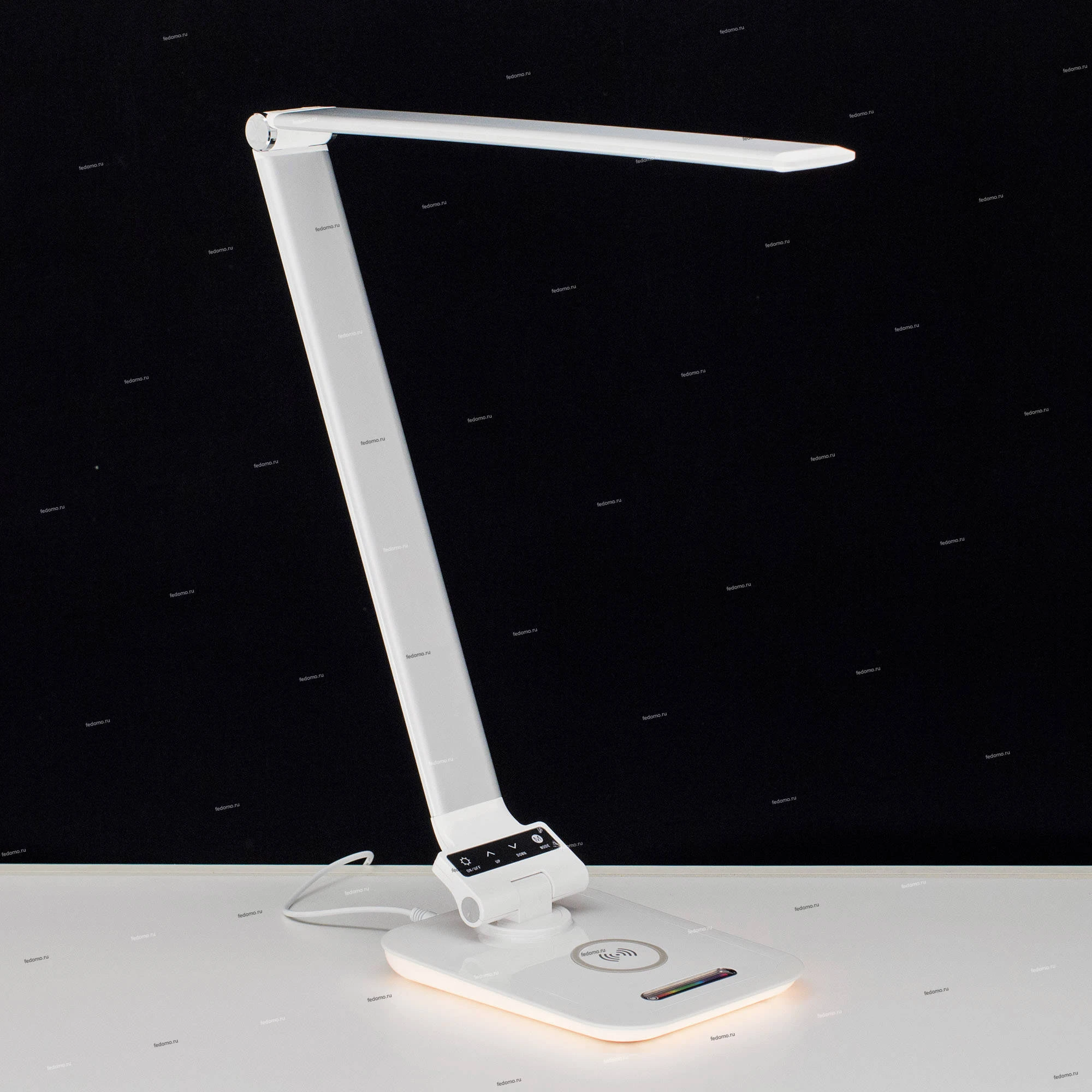 Светодиодная настольная лампа 6W (~450 люмен) с регулировкой яркости и цветовой температуры, беспроводным зарядным устройством для смартфонов, USB зарядным устройством, RGB-ночником (подсветкой основания лампы). Габариты основания 15*20см, Высота стойки