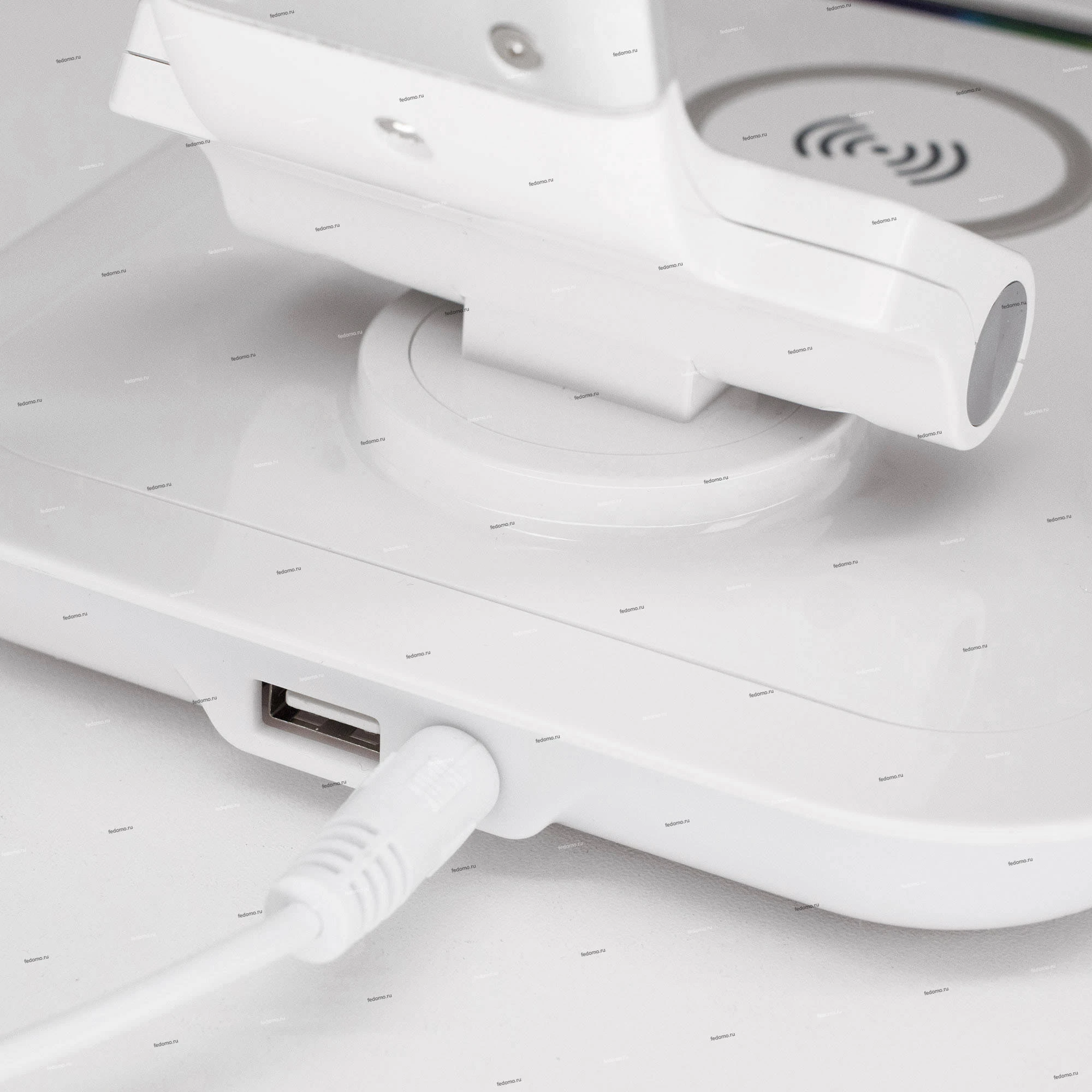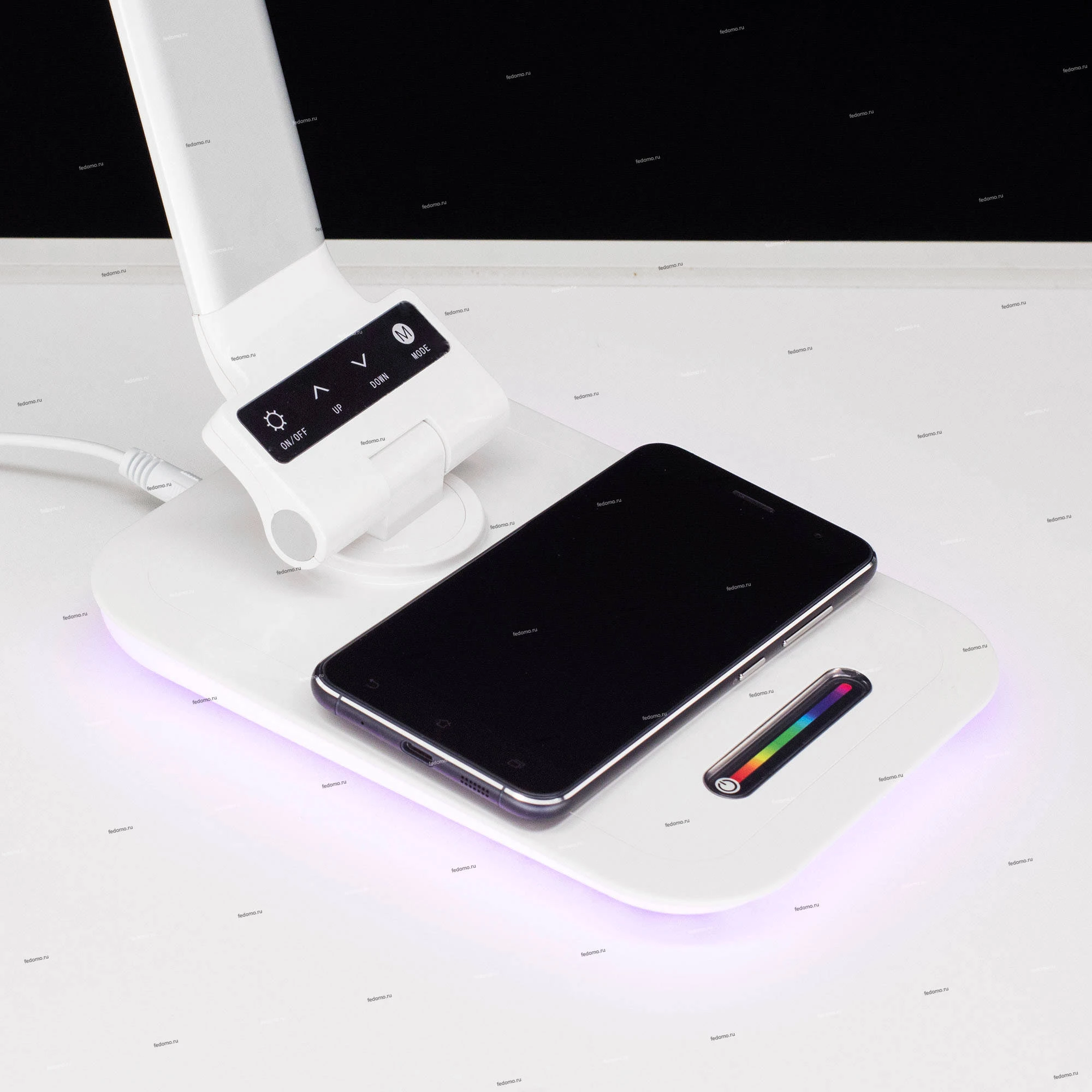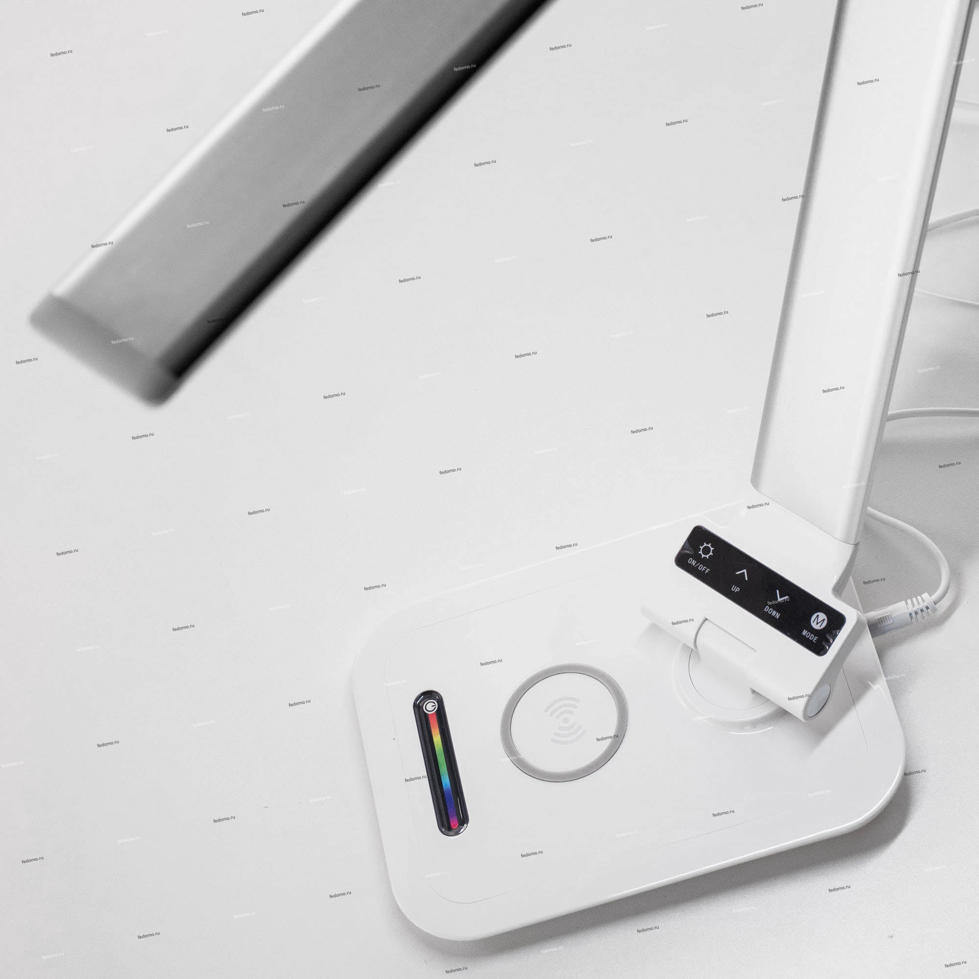 Светодиодная настольная лампа 6W (~450 люмен) с регулировкой яркости и цветовой температуры, беспроводным зарядным устройством для смартфонов, USB зарядным устройством, RGB-ночником (подсветкой основания лампы). Габариты основания 15*20см, Высота стойки