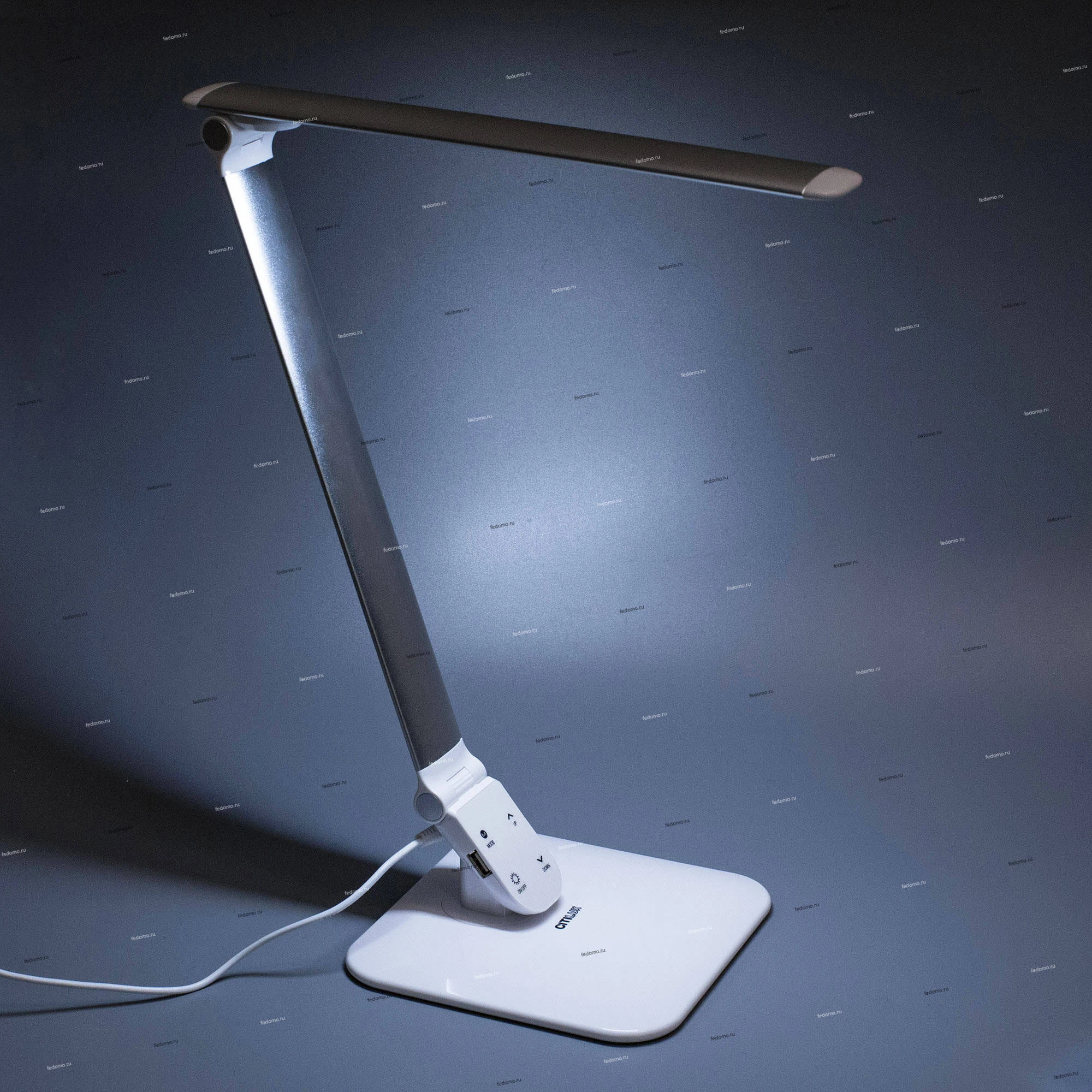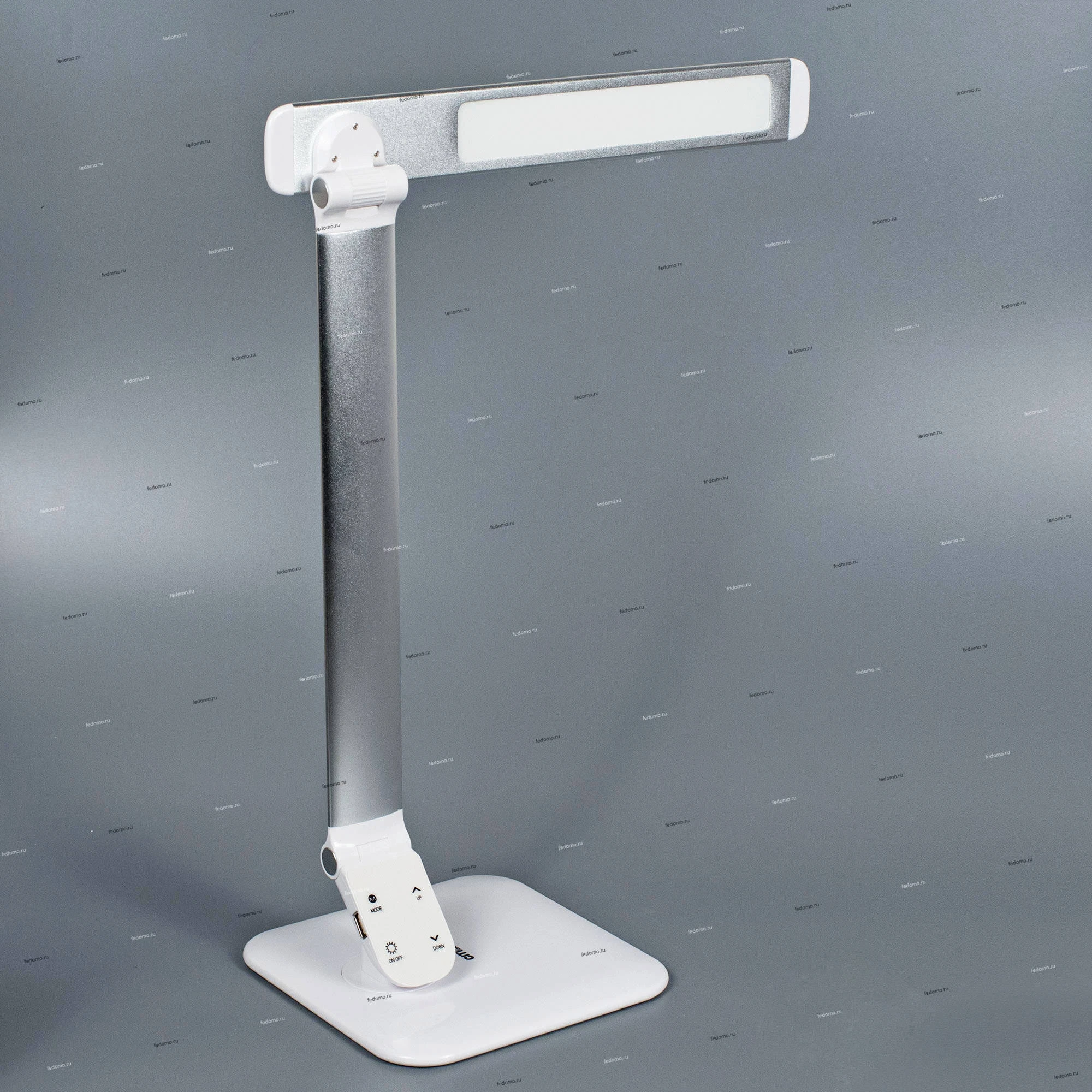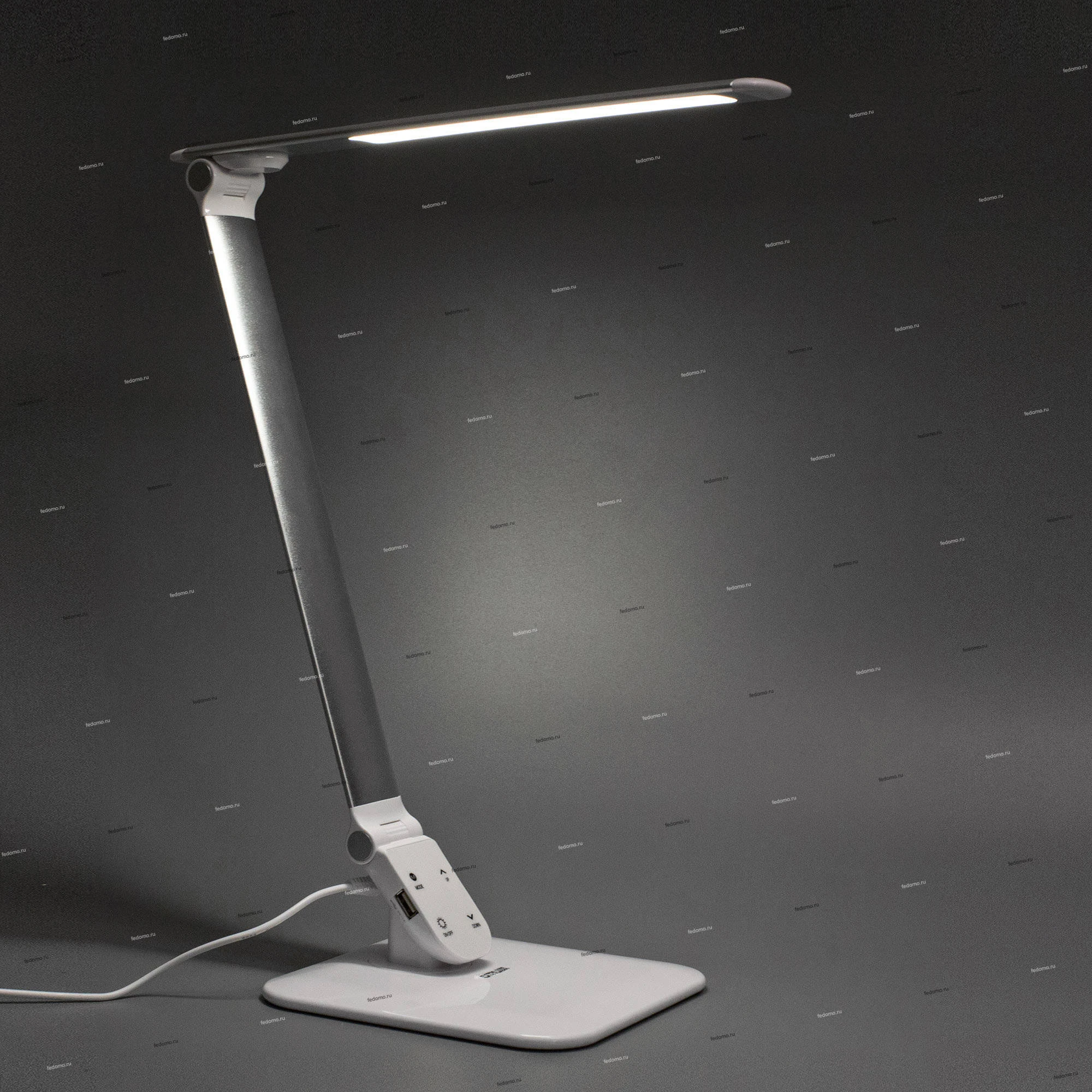 Светодиодная настольная лампа 7W (~500 люмен) с регулировкой яркости и цветовой температуры, мощным USB зарядным устройством (до 2000mA). Габариты основания 18*18см, Высота 43см, Длина световой панели 33см, положение стойки и световой панели регулируется