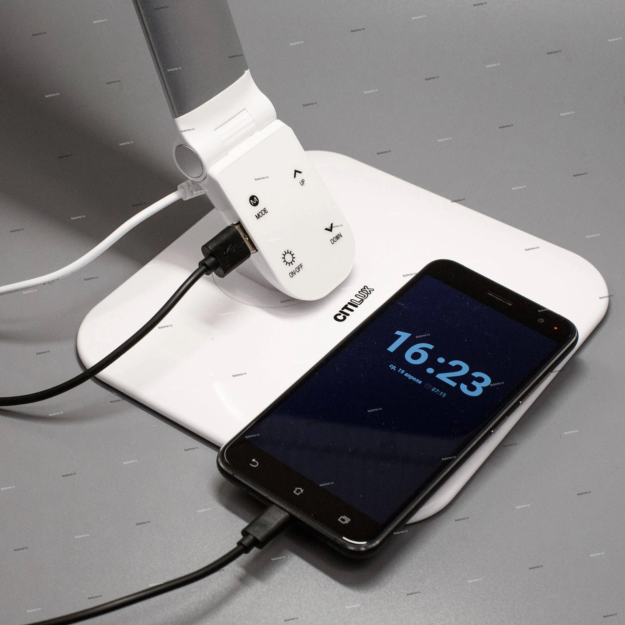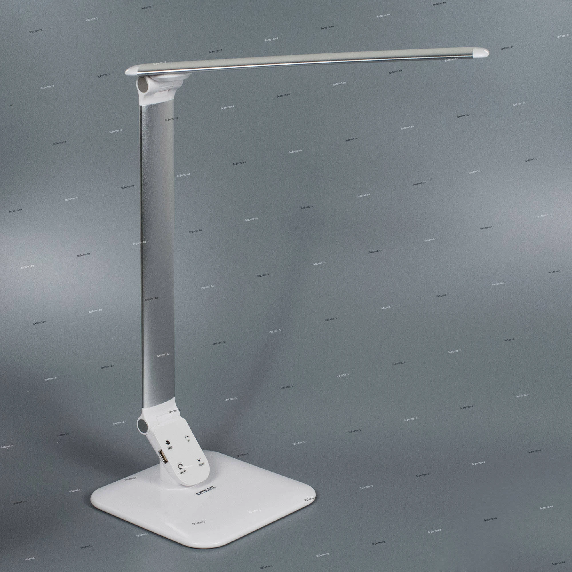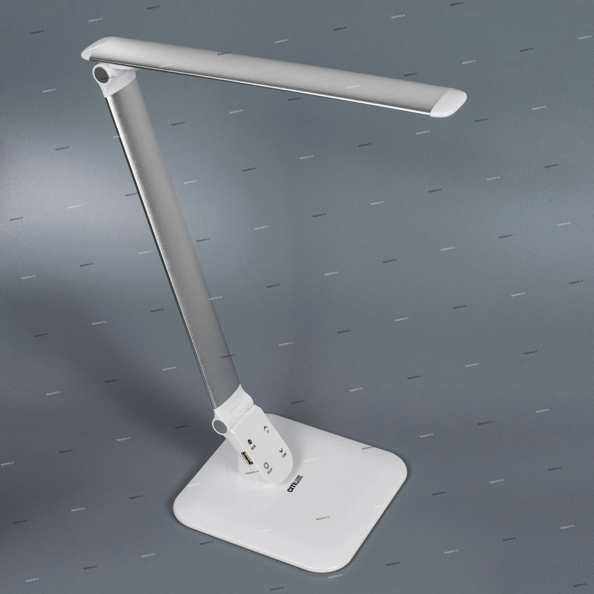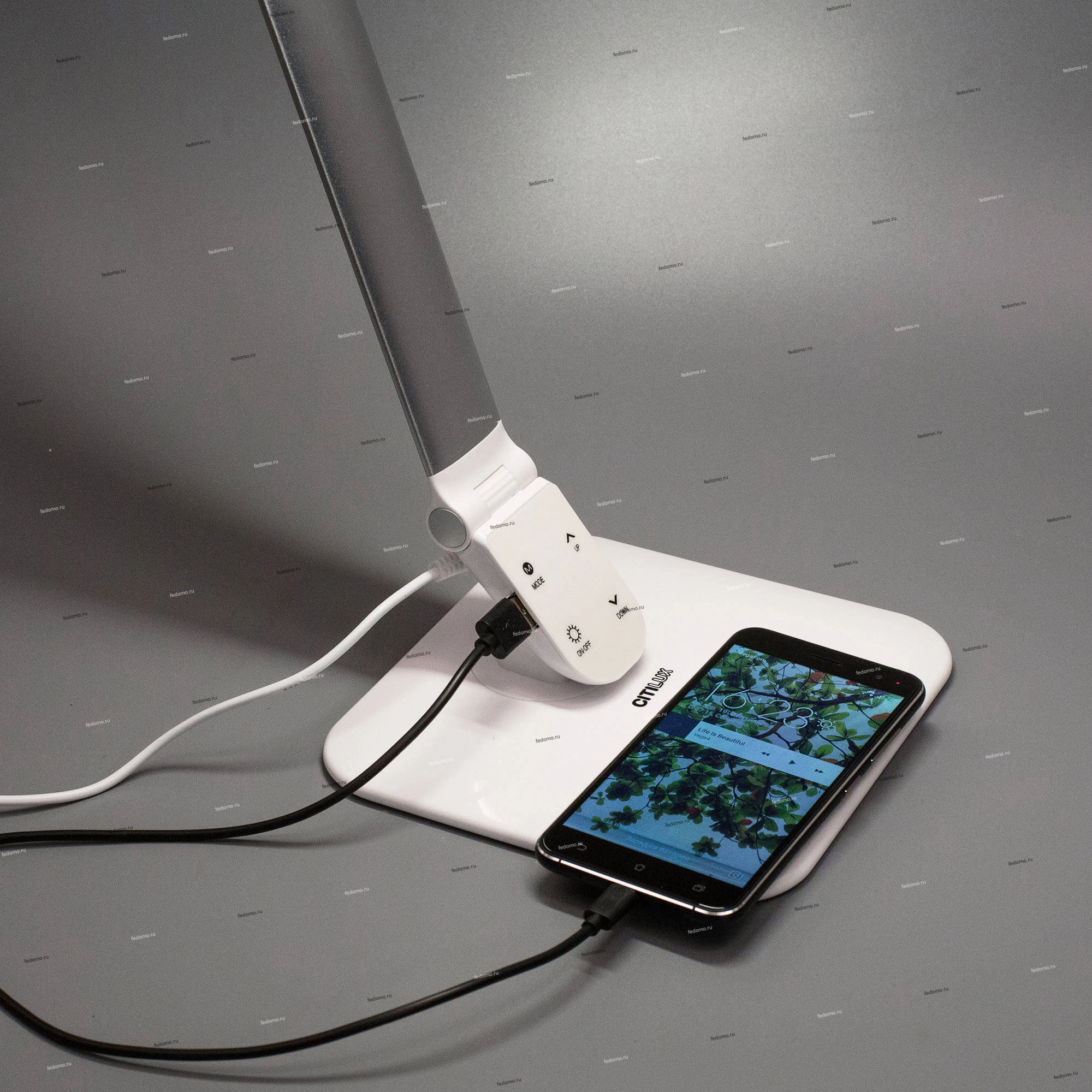 Светодиодная настольная лампа 7W (~500 люмен) с регулировкой яркости и цветовой температуры, мощным USB зарядным устройством (до 2000mA). Габариты основания 18*18см, Высота 43см, Длина световой панели 33см, положение стойки и световой панели регулируется