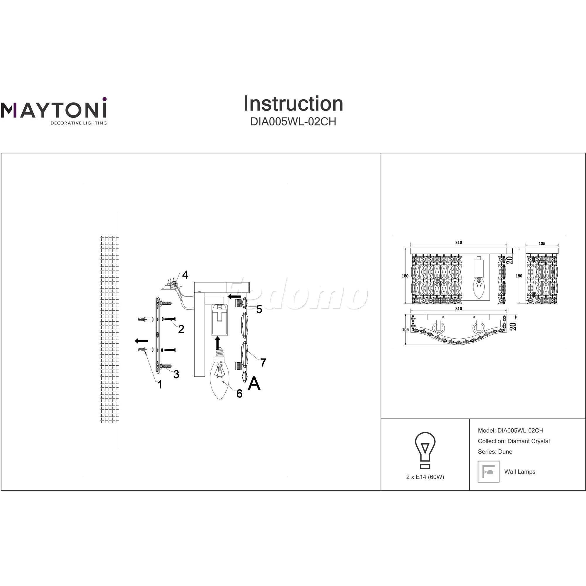 Настенный светильник DIA005WL-02CH из серии Maytoni Dune от компании Maytoni подойдет для освещения прихожей и коридора, спальни, оформленных в стиле классический. Основной цвет изделия - глянцевый хром, материал плафона - зеркальный хрусталь. Рассчитан на 2 лампочки с цоколем E14 и освещает площадь до 6 кв. м. Модель поддерживает установку диммера. Лучшая цена и условия доставки на Maytoni Dune DIA005WL-02CH в интернет-магазине Fedomo.ru.