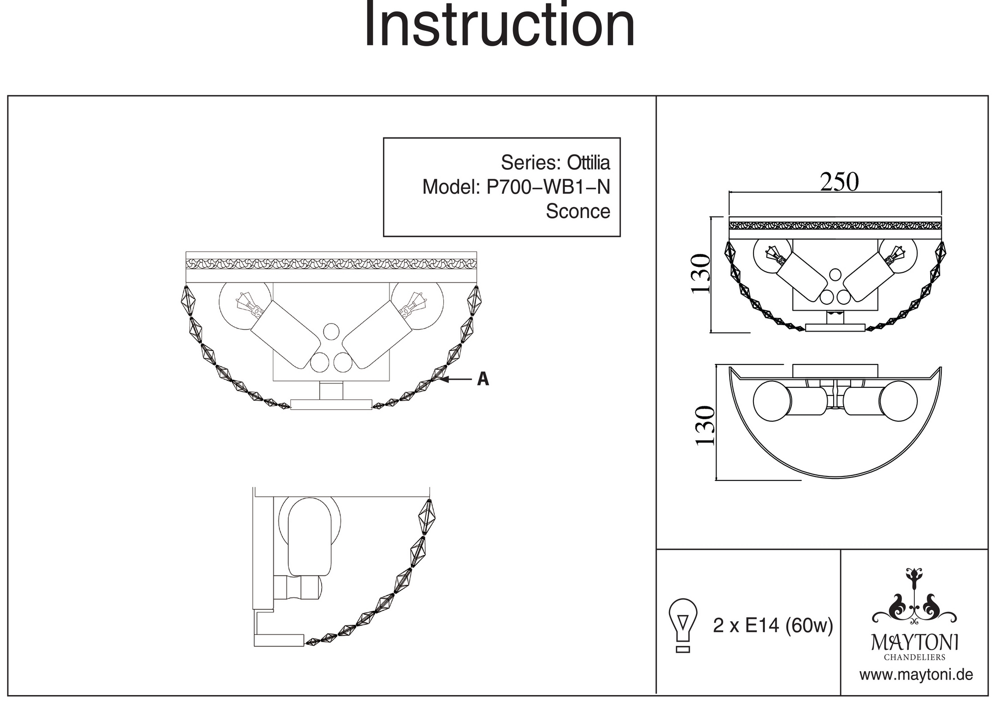 Бра хрустальное DIA700-WL-02-N из серии Ottilia от компании Maytoni отлично подойдет в качестве дополнительного источника света для гостиной, выполненной в стиле классический, ампир. Основной цвет модели - никель, материал арматуры - металл. Однорожковое бра имеет 2 лампочки, оснащено цоколем E14 с общей мощностью 120W и напряжением 220V. Светильник поддерживает подключение диммера. В комплекте лампочки, перчатки для сборки хрусталя. Лучшая цена и условия доставки на Maytoni DIA700-WL-02-N в интернет-магазине Fedomo.ru.