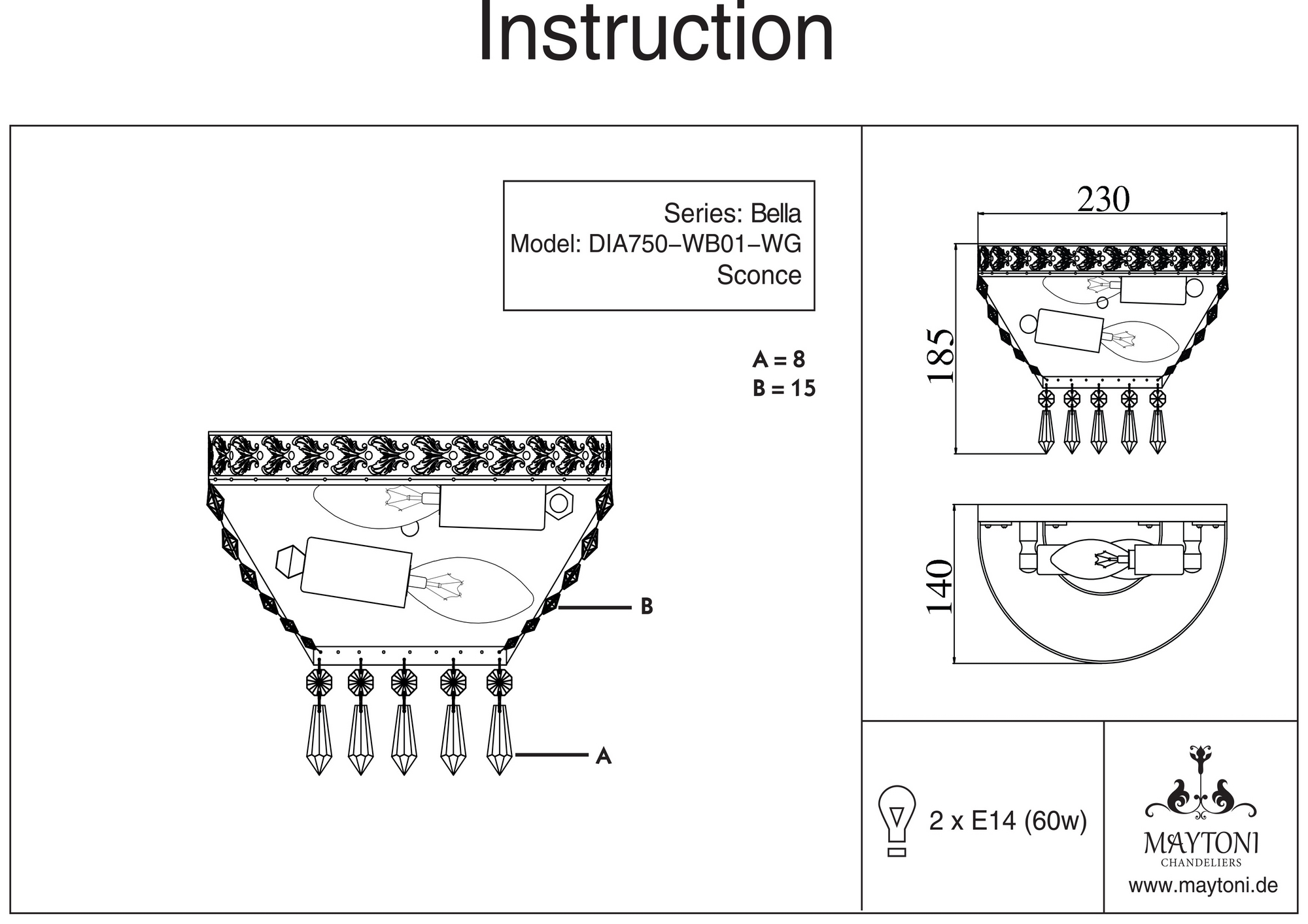 Бра хрустальное DIA750-WB01-WG из серии Bella от компании Maytoni украшено хрусталем и отлично подойдет в качестве дополнительного источника света для гостиной, выполненной в стиле классический, ампир. Основной цвет модели - бежевый, материал арматуры - металл. Однорожковое бра имеет 2 лампочки, оснащено цоколем E14 с общей мощностью 120W и напряжением 220V. Декоративный абажур направлен вверх, материал изготовления - прозрачный хрусталь. Светильник поддерживает подключение диммера. В комплекте лампочки, перчатки для сборки хрусталя. Лучшая цена и условия доставки на Maytoni DIA750-WB01-WG в интернет-магазине Fedomo.ru.