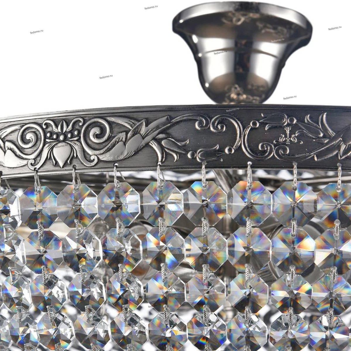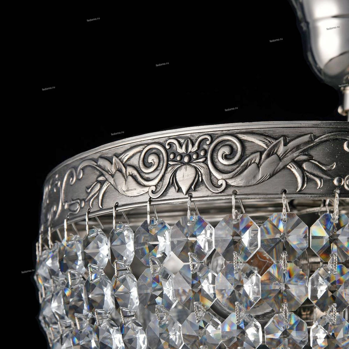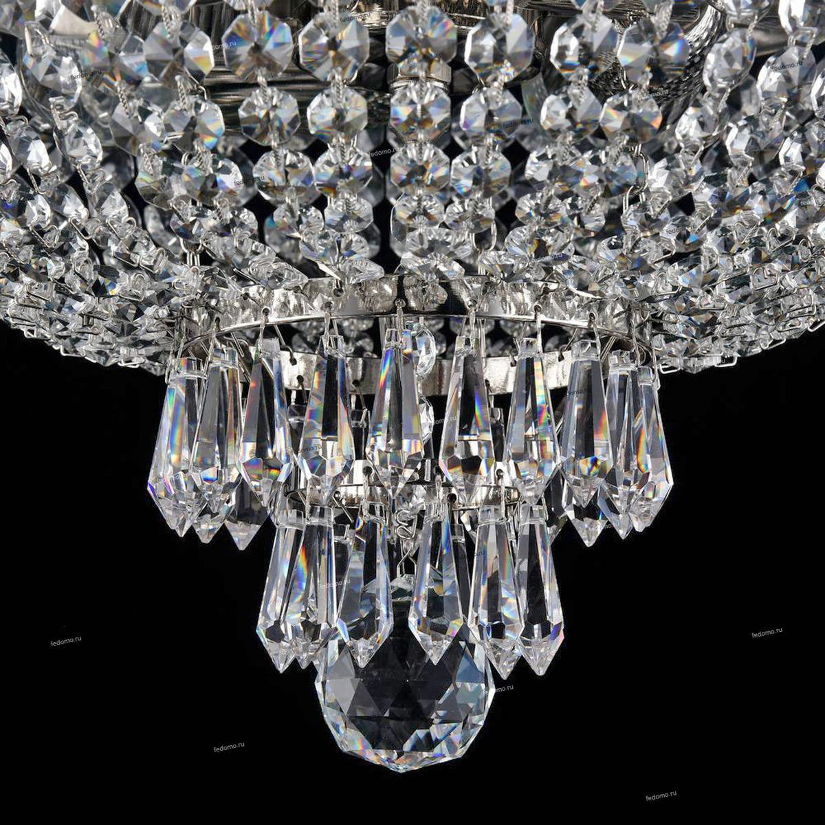 Каркас из металла с золотым и хромовым покрытием. Обрамление латунной лентой с ручным чернением. Разнообразная огранка подвесок из хрусталя высшего класса.
