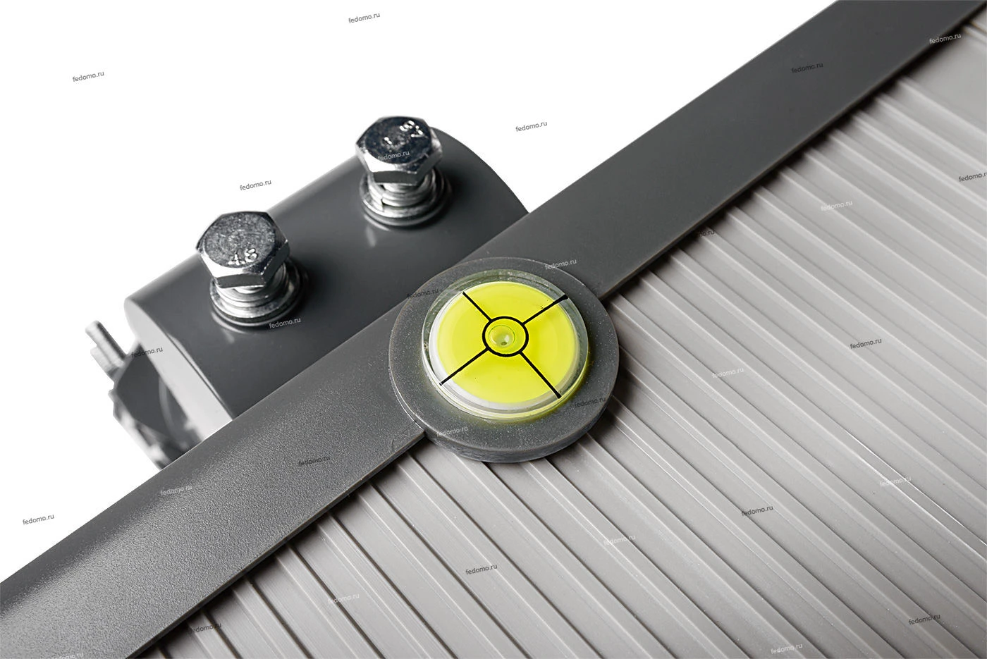 Большая площадь узла крепления к кронштейну. Крепление выдерживает высокие вибрационные нагрузки. Встроенный уровень обеспечивает точную установку светильника в горизонтальной плоскости относительно освещаемой поверхности. Большая плоскость радиатора обеспечивает оптимальный отвод тепла даже при загрязнении (пыль, грязь и опавшие листья). Соблюдение защитных углов в конструкции (спад силы света при углах более 70 градусов) существенно ограничивает слепящее действие. Возможна замена светоизлучающего элемента без демонтажа корпуса светильника с опоры. Отсутствие защитного стекла снижает потери светового потока. Возможна замена блока питания без демонтажа светильника с опоры. Уникальный узел крепления светильника позволяет регулировать угол наклона относительно кронштейна в диапазоне 90 градусов. Встроенная в узел крепления монтажная коробка позволяет производить коммутацию, не снимая светильник с опоры. Соответствует международным стандартам EN13201, IESNA RP-8-00