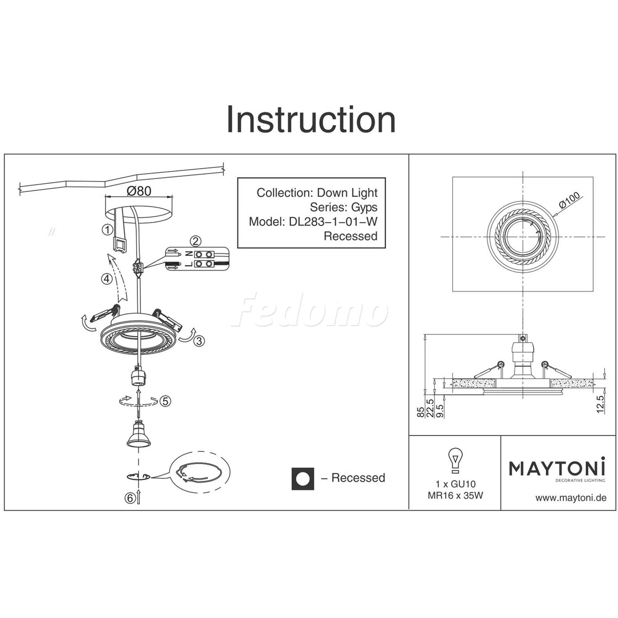 Точечный светильник встроенный DL283-1-01-W из серии Gyps Classic от компании Maytoni удачно впишется в интерьер гостиной, спальни, оформленных в стиле прованс. Светильник имеет 1 плафон и 1 лампочку с цоколем GU10 с мощностью 35W, напряжением 220V. Модель поддерживает подключение диммера. Светильник устанавливается на распорную пружину. Основной цвет и материал арматуры - белый металл, материал плафона - гипс. Лампочки в комплект не входят. Габариты модели: высота - 97 мм, диаметр - 100 мм. Лучшая цена и условия доставки на Maytoni DL283-1-01-W в интернет-магазине Fedomo.ru.
