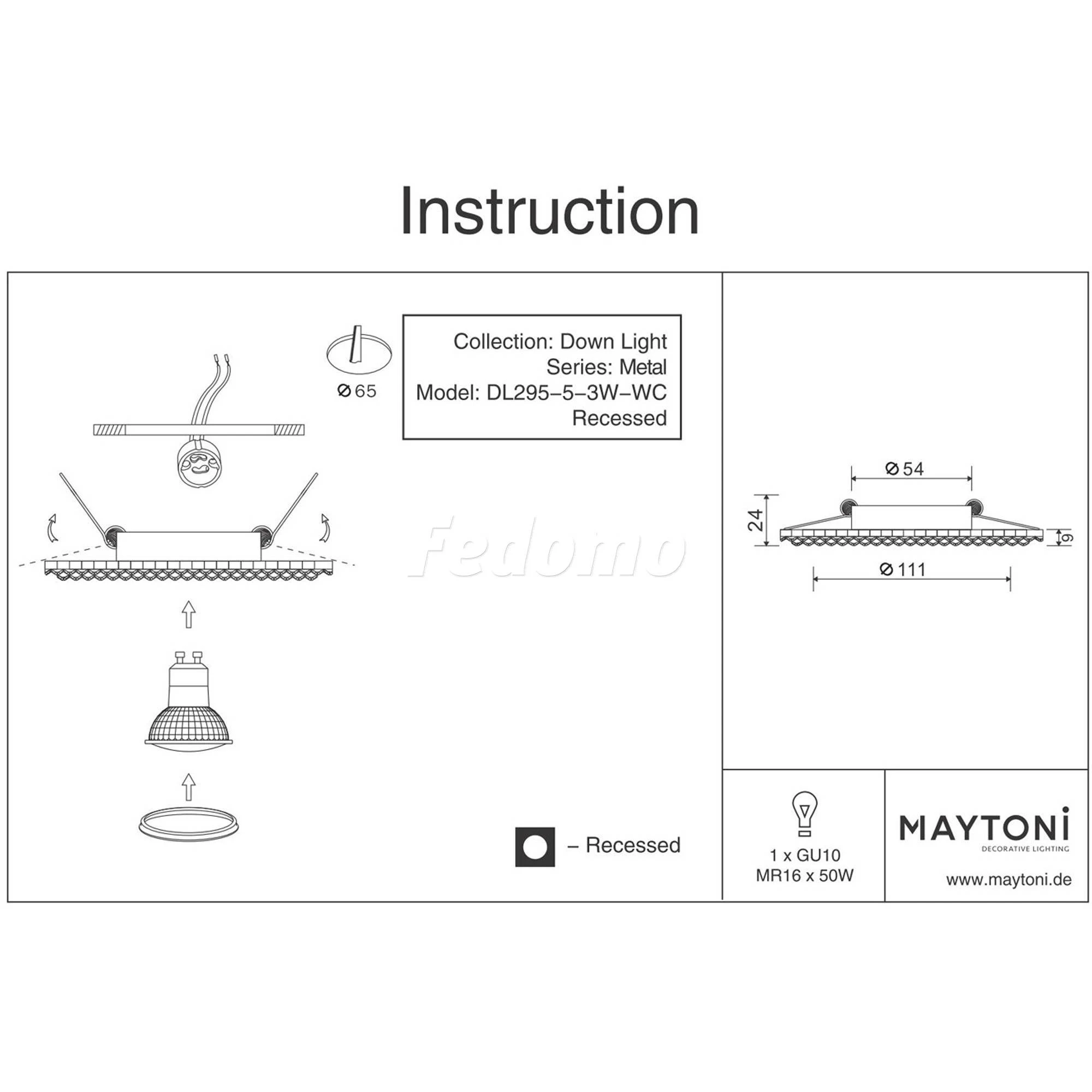 Точечный светильник встроенный DL295-5-3W-WC из серии Metal от компании Maytoni удачно впишется в интерьер гостиной, спальни, оформленных в классическом стиле. Светильник имеет 1 плафон и 1 лампочку с цоколем GU10 с мощностью 50W, напряжением 220V. Модель поддерживает подключение диммера. Основной цвет и материал арматуры - белый металл, материал плафона - стекло. Лампочки в комплект не входят. Габариты модели: высота - 72 мм, диаметр - 111 мм. Лучшая цена и условия доставки на Maytoni DL295-5-3W-WC в интернет-магазине Fedomo.ru.