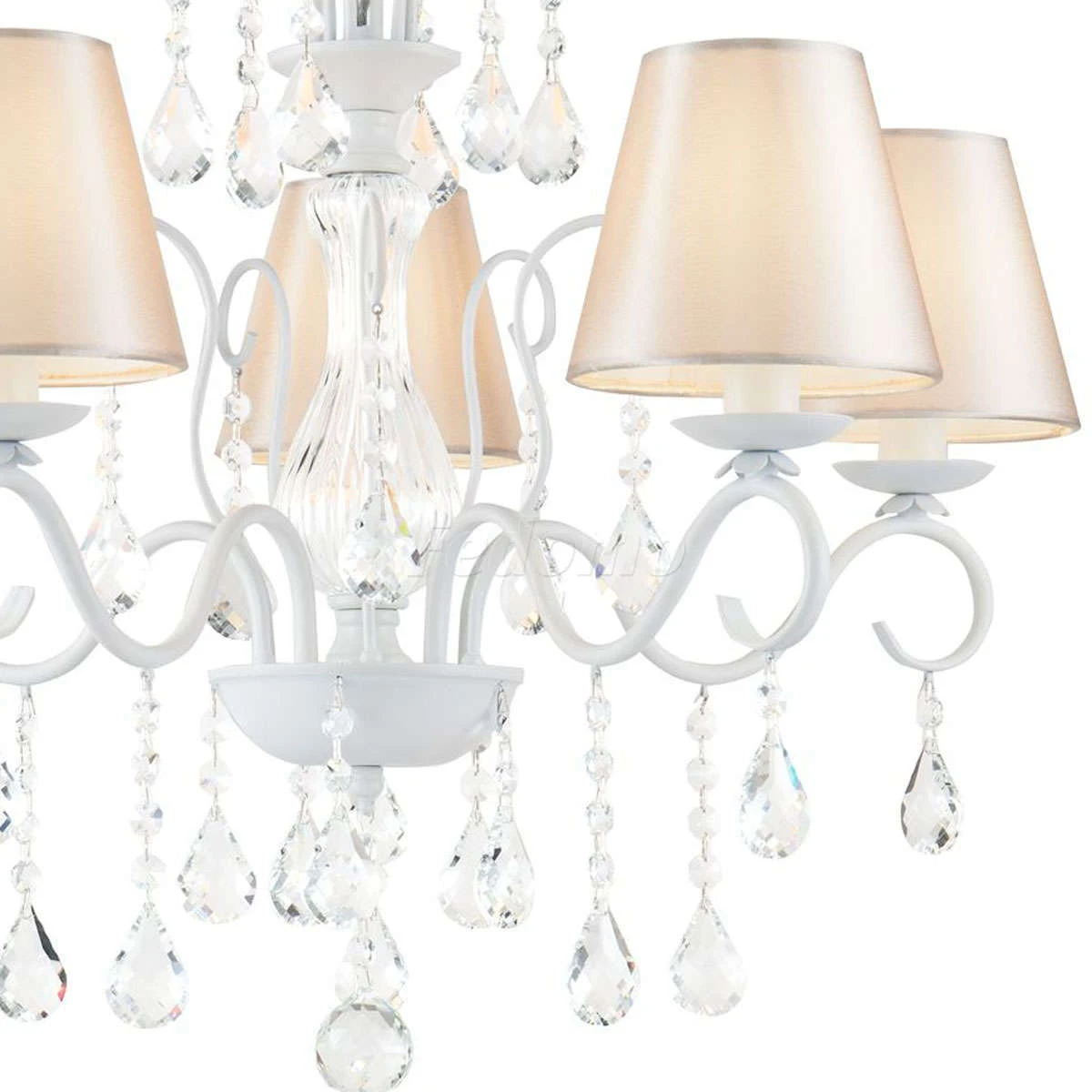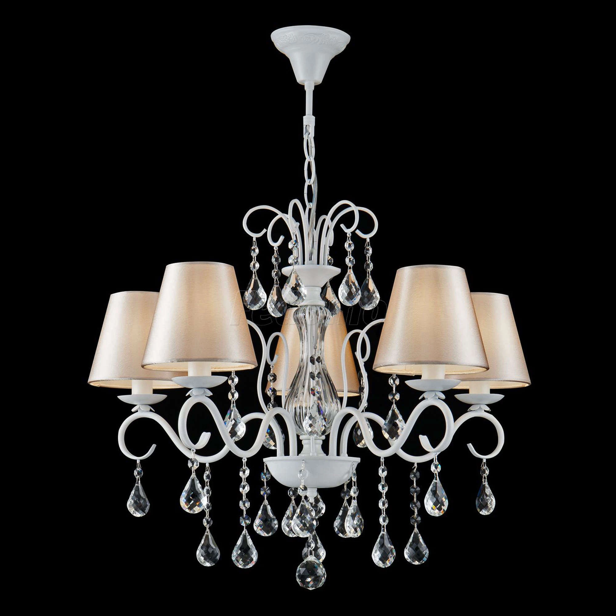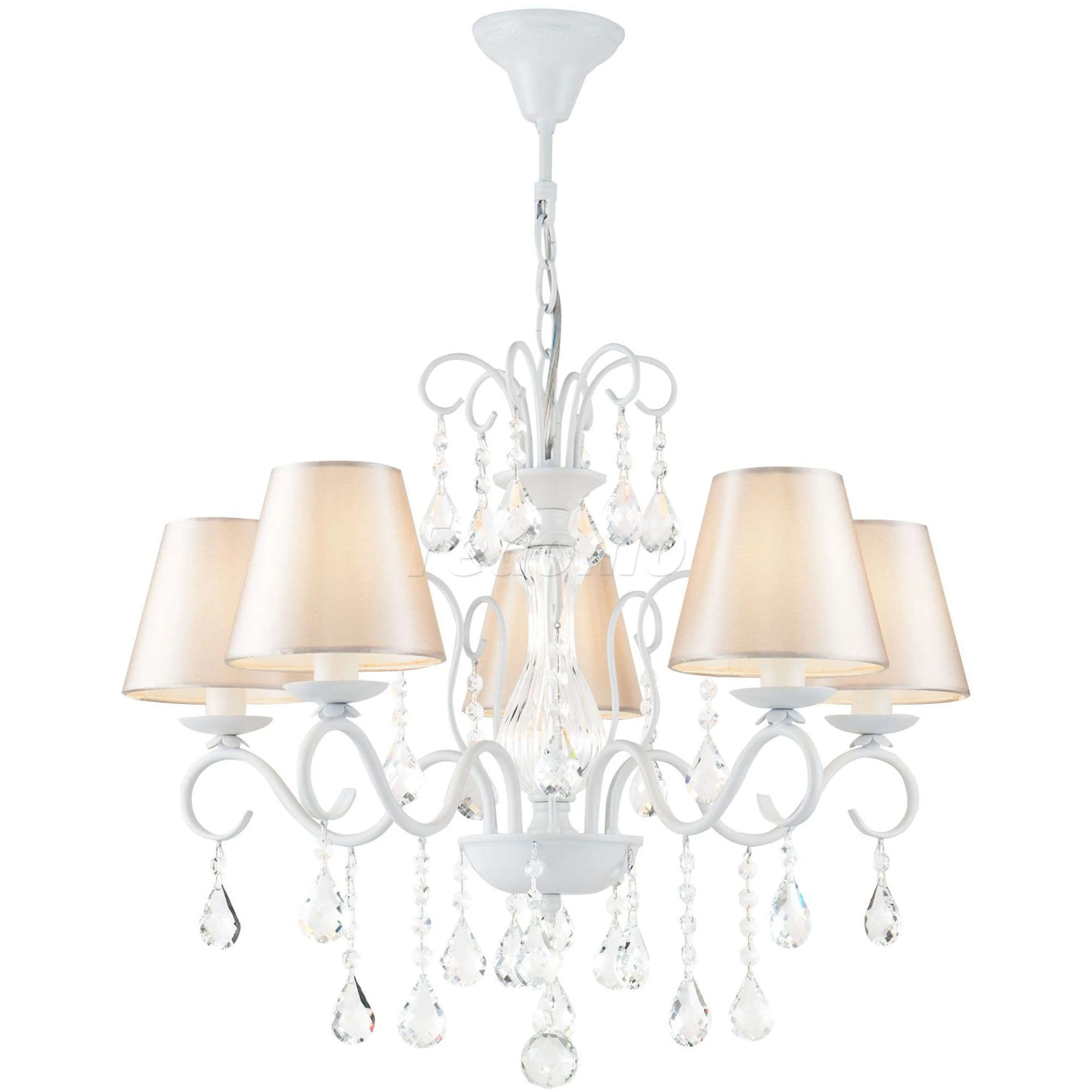 Серия элегантных классических светильников. Центральная часть из прозрачного стекла придает белой металлической арматуре воздушности, а подвески из кристаллов усиливают этот эффект. Абажуры сделаны из атласа на ПВХ.