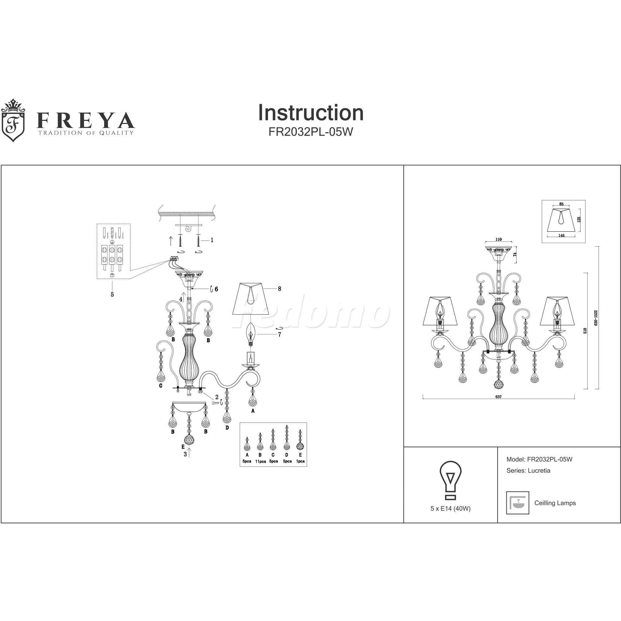 Люстра подвесная FR2032PL-05W из серии Lucretia от компании Freya регулируется по высоте и устанавливается на металлический крюк. Классическая люстра прекрасно подойдет в качестве источника основного света для гостиной, кухни, оформленных в стиле прованс. Основной цвет модели - розовый, материал арматуры - металл, стекло. Люстра имеет 5 абажуров со свечением вверх, материал изготовления - матовая ткань, ПВХ. Модель оснащена цоколем E14 (5xE14), имеет 5 лампочек с общей мощностью 200W и напряжением 220V. Светильник поддерживает подключение диммера. Габариты: высота - 518 мм, диаметр - 637 мм. Лампочки в комплект не входят. Лучшая цена и условия доставки на Freya FR2032PL-05W в интернет-магазине Fedomo.ru.