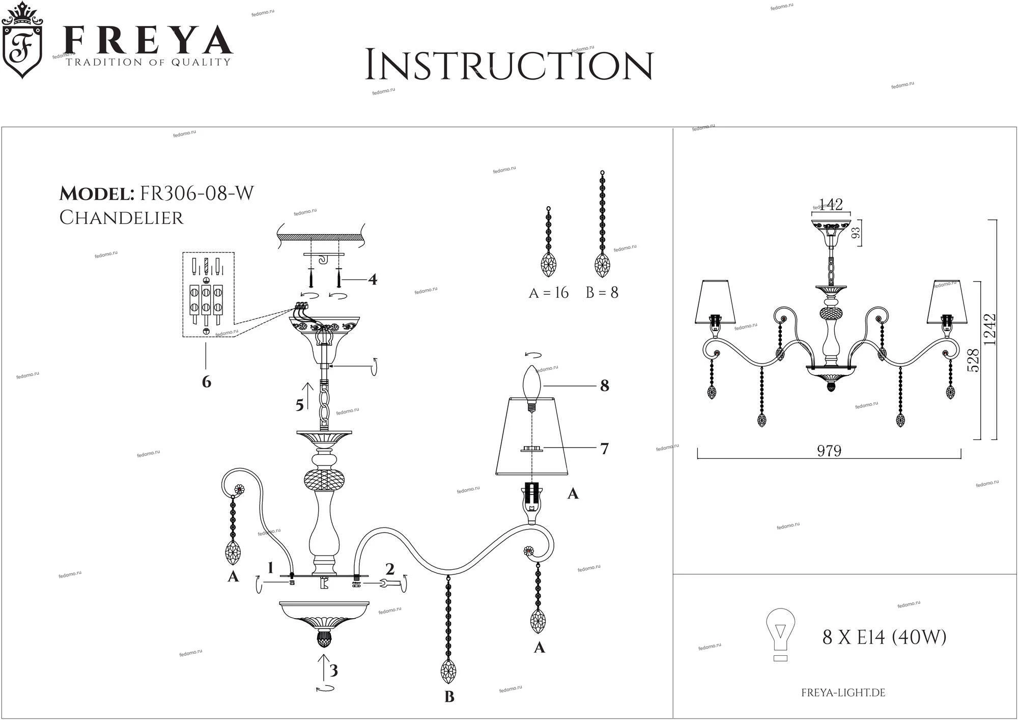 Конструкция подвесной люстры позволяет регулировать высоту изменением длины цепи. Полностью укоротив цепь, светильник будет закреплен максимально близко к потолку и внешне будет похож на потолочный. Устаревший артикул: FR306-08-W