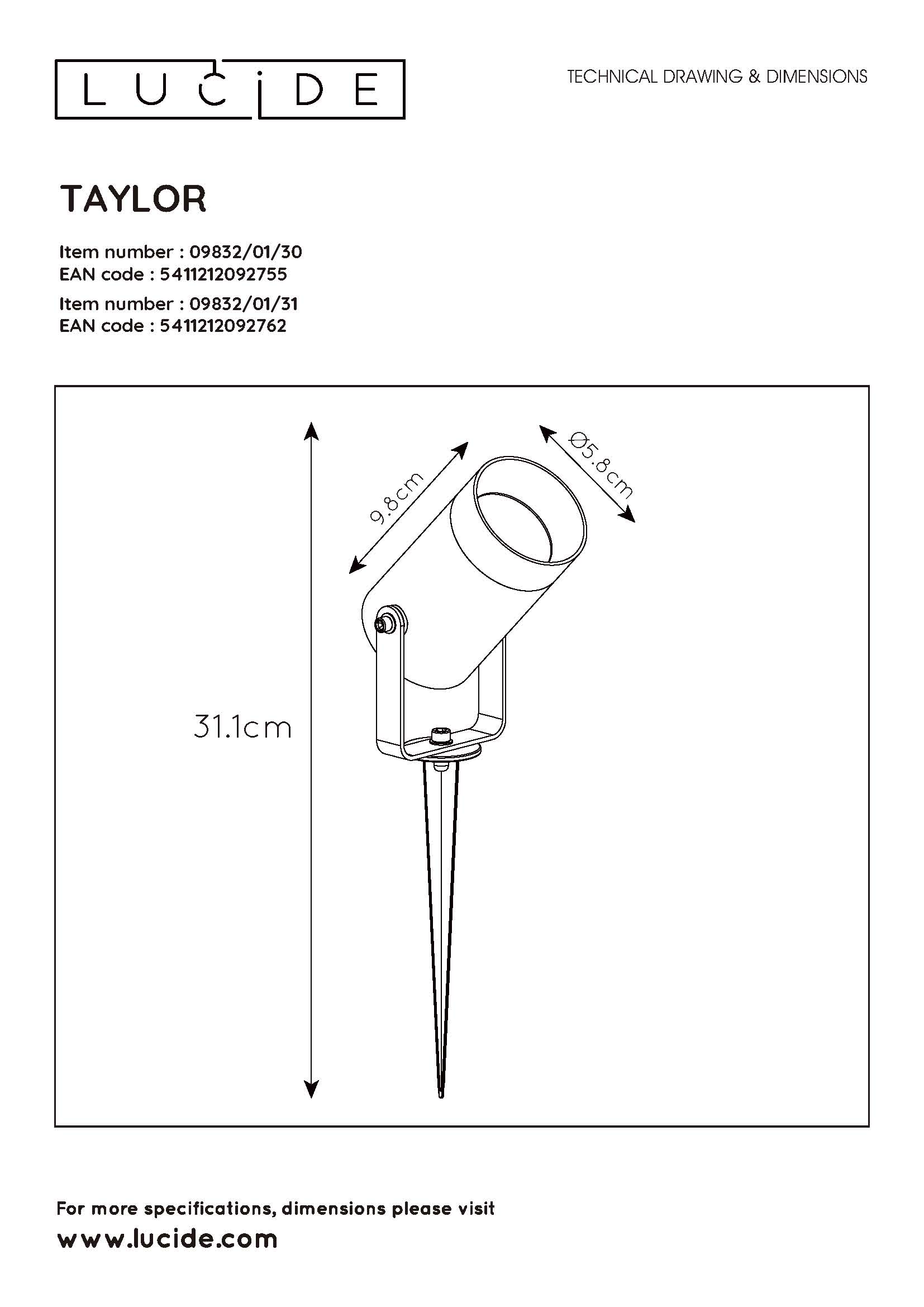 Грунтовый светильник Taylor 09832/01/30 от бельгийского бренда Lucide изготовлен из алюминия в черном цвете. Рассчитан на лампочки с цоколем 1xGU10, мощность 50 Вт. Стиль – техно. Модель имеет 1 плафон из алюминия, подходит для установки на улице на полу в саду. Освещаемая площадь до 4 кв. м. Питание от сети 220 В. Способ крепления – на основание, в грунт. Габариты: длина 100 мм, ширина 100 мм, высота 260 мм, диаметр 100 мм. Дополнительные функции: подходит для подключения к диммеру, направление света регулируется. Заказывайте Lucide 09832/01/30 онлайн по низкой цене с гибкими условиями доставки на Fedomo.ru!