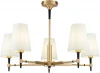 Металлическая арматура, гальванизация в цвет латуни. Часть элементов окрашена в черный цвет. Абажуры из белого текстиля, нанесенного на ПВХ. Источник света - лампа с цоколем Е14.