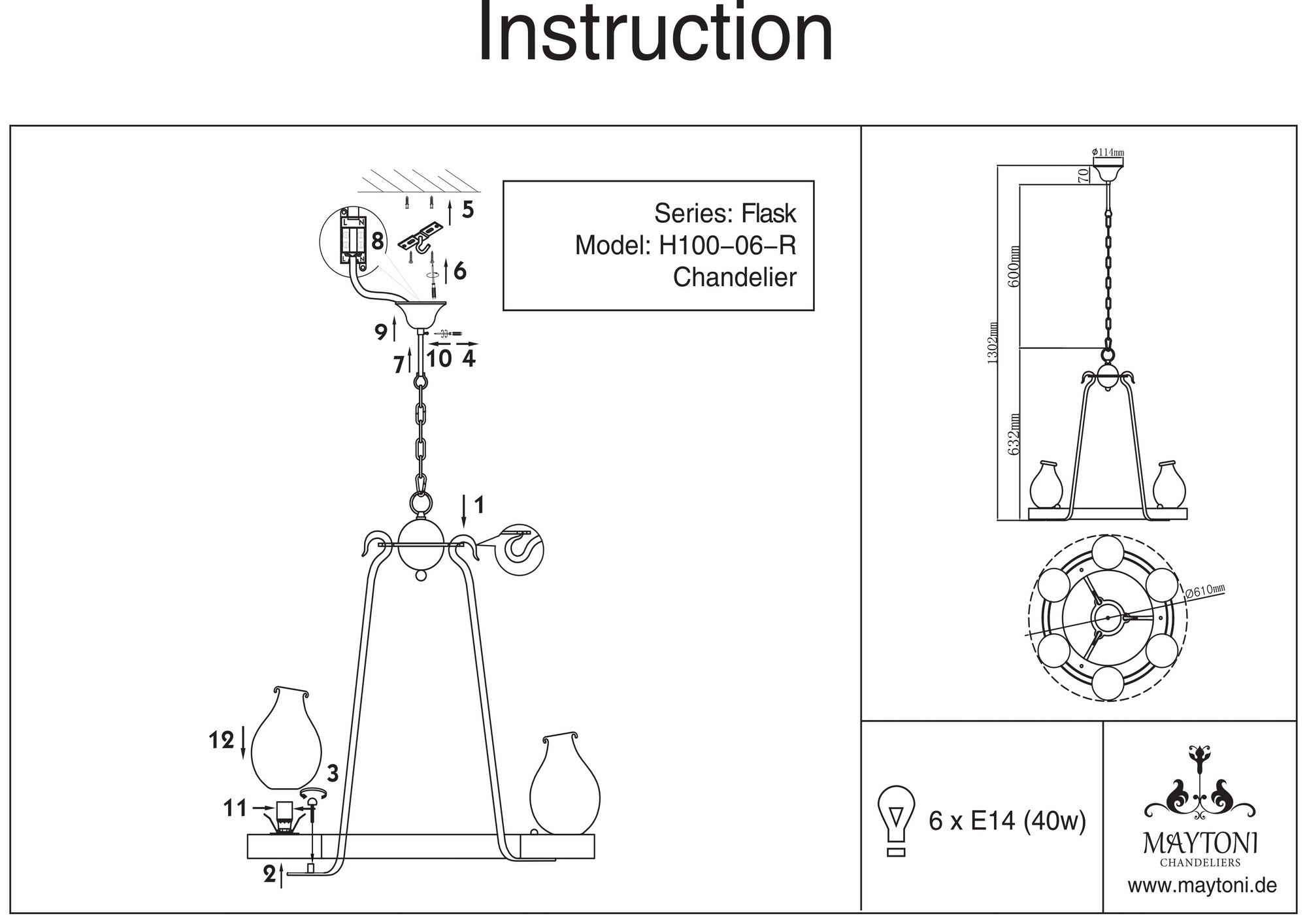 Люстра подвесная H100-06-R из серии House 4 от компании Maytoni устанавливается на металлический крюк. Люстра в виде бутылки прекрасно подойдет в качестве источника основного света для гостиной, кухни, кабинета, оформленных в стиле кантри, лофт, индустриальный. Основной цвет модели - коричневый, материал арматуры - металл, дерево. Люстра имеет 6 плафонов со свечением вверх, материал изготовления - стекло. Модель оснащена цоколем E14 (6xE14), имеет 6 лампочек с общей мощностью 240W и напряжением 220V. Светильник поддерживает подключение диммера. Габариты: высота - 1232 мм, диаметр - 610 мм. Лампочки в комплект не входят. Лучшая цена и условия доставки на Maytoni H100-06-R в интернет-магазине Fedomo.ru.